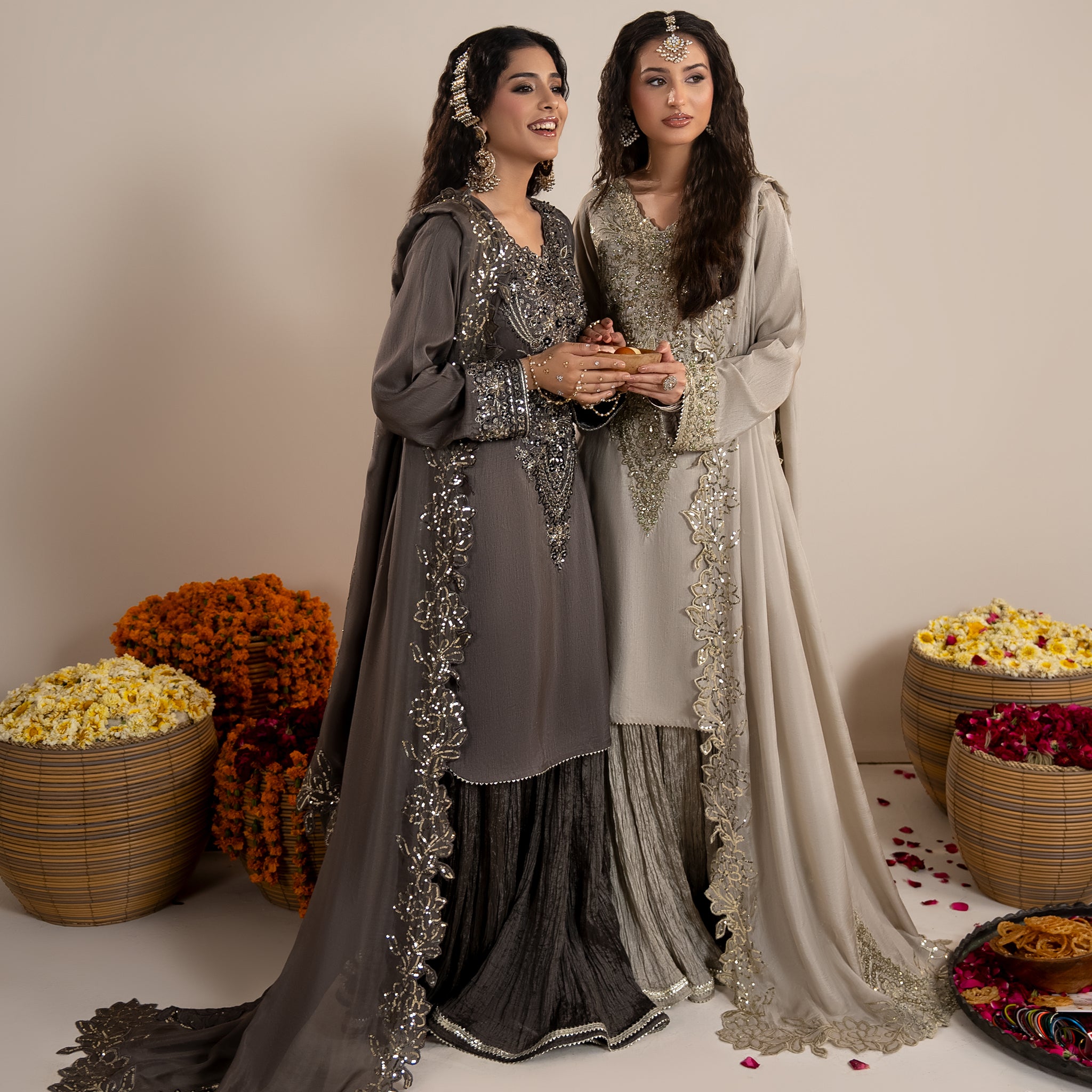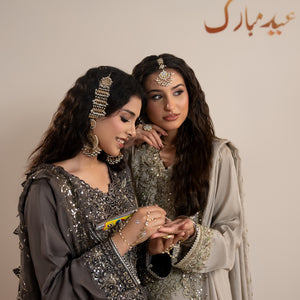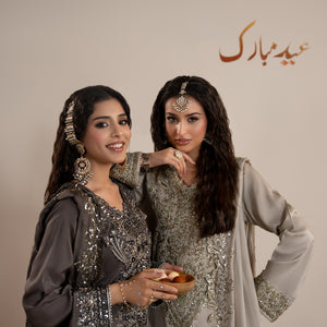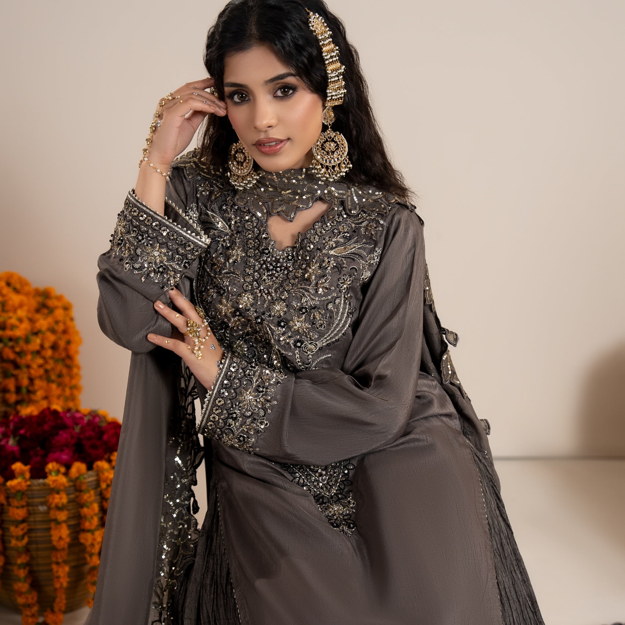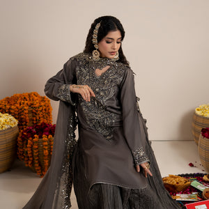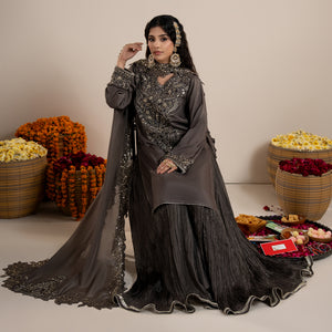 Medium lenght shirt with crushed sharara paired with Medium silk organza duppata, an outfit completes the look with heavy embroidery and embellishment.