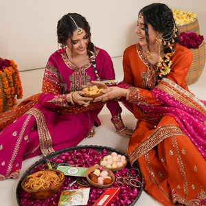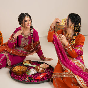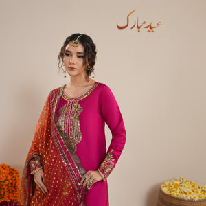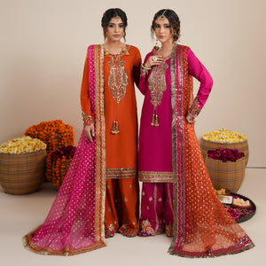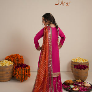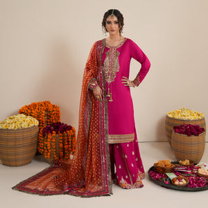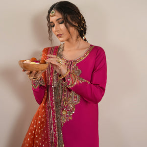 Medium lenght shirt with crushed sharara paired with Medium silk organza duppata, an outfit completes the look with heavy embroidery and embellishment.