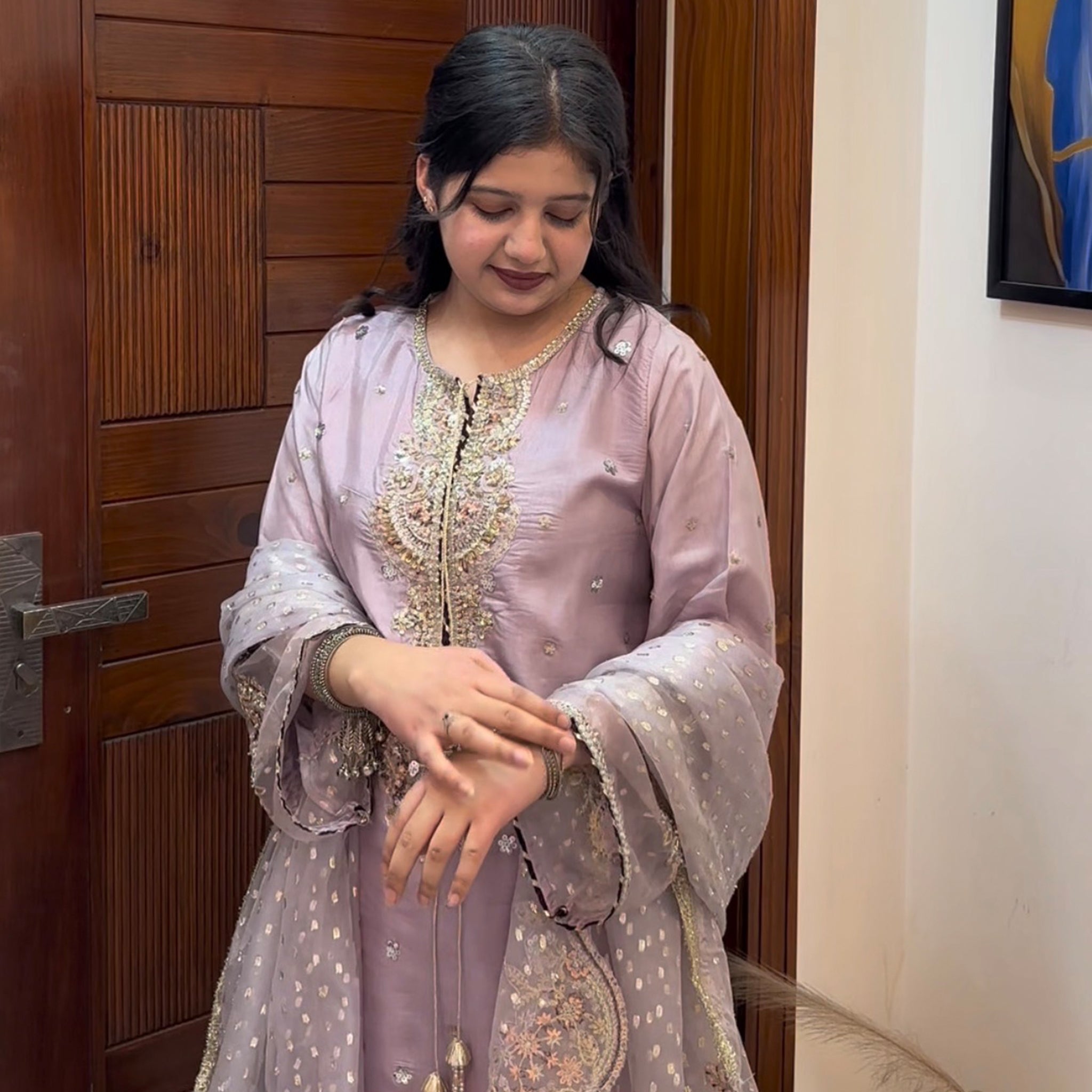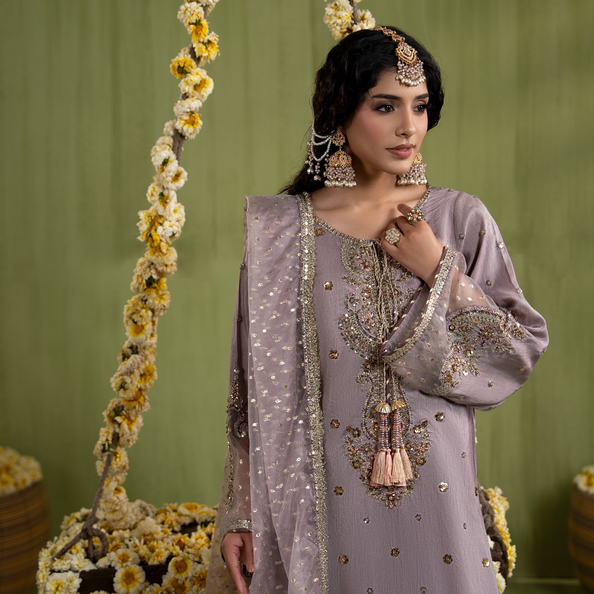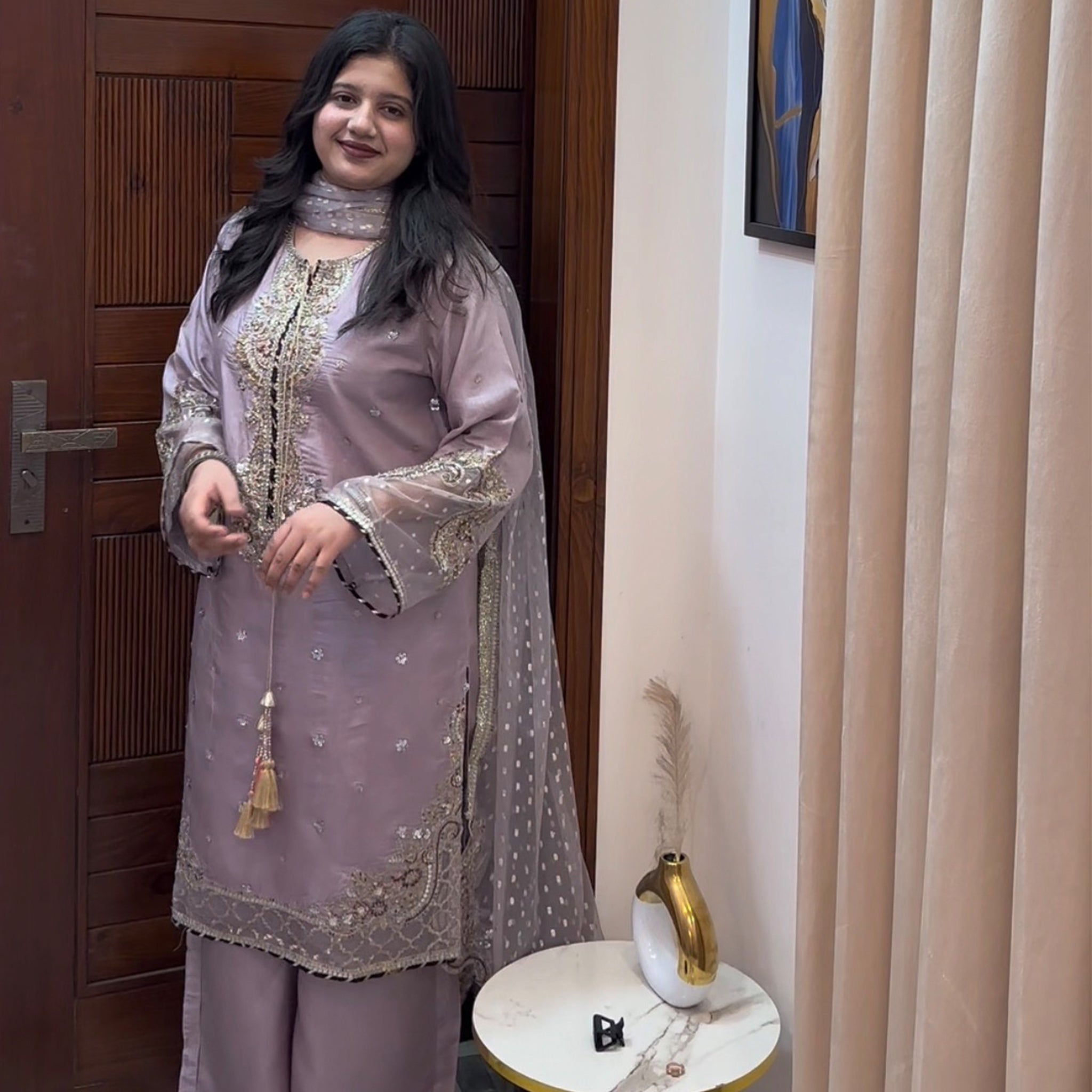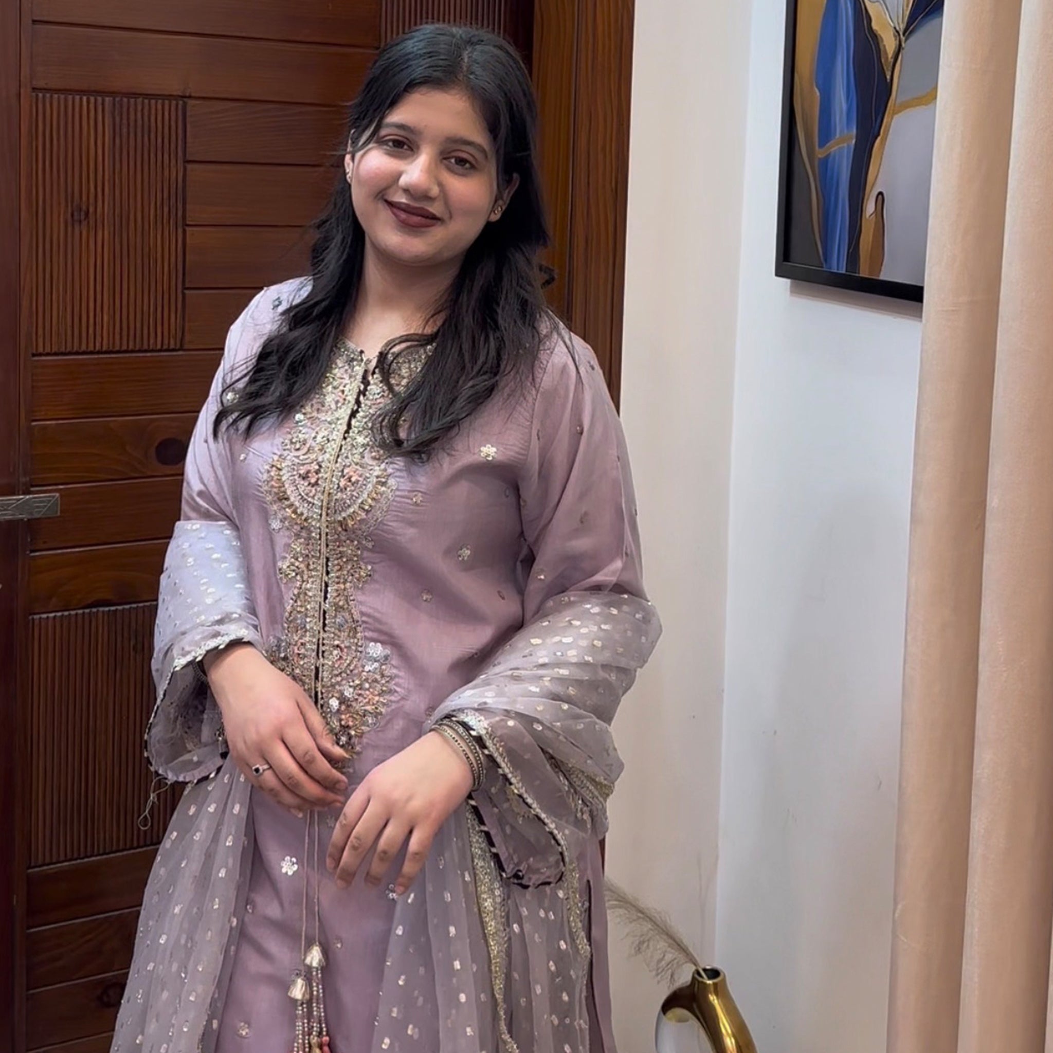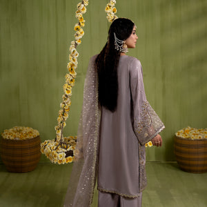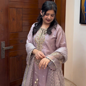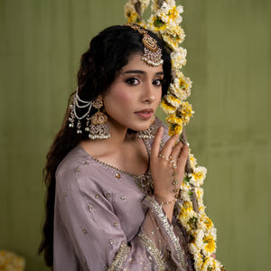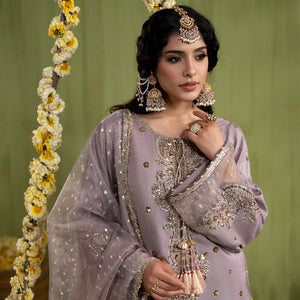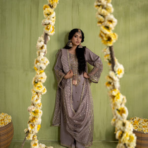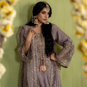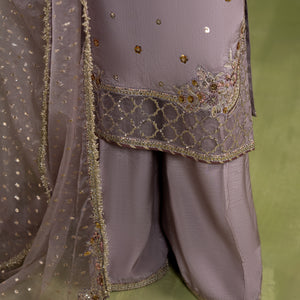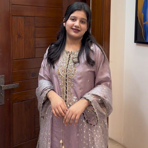 Medium lenght shirt with crushed sharara paired with Medium silk organza duppata, an outfit completes the look with heavy embroidery and embellishment.