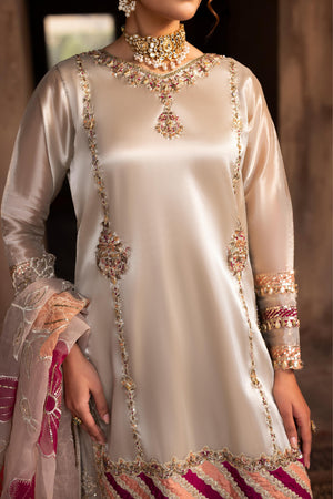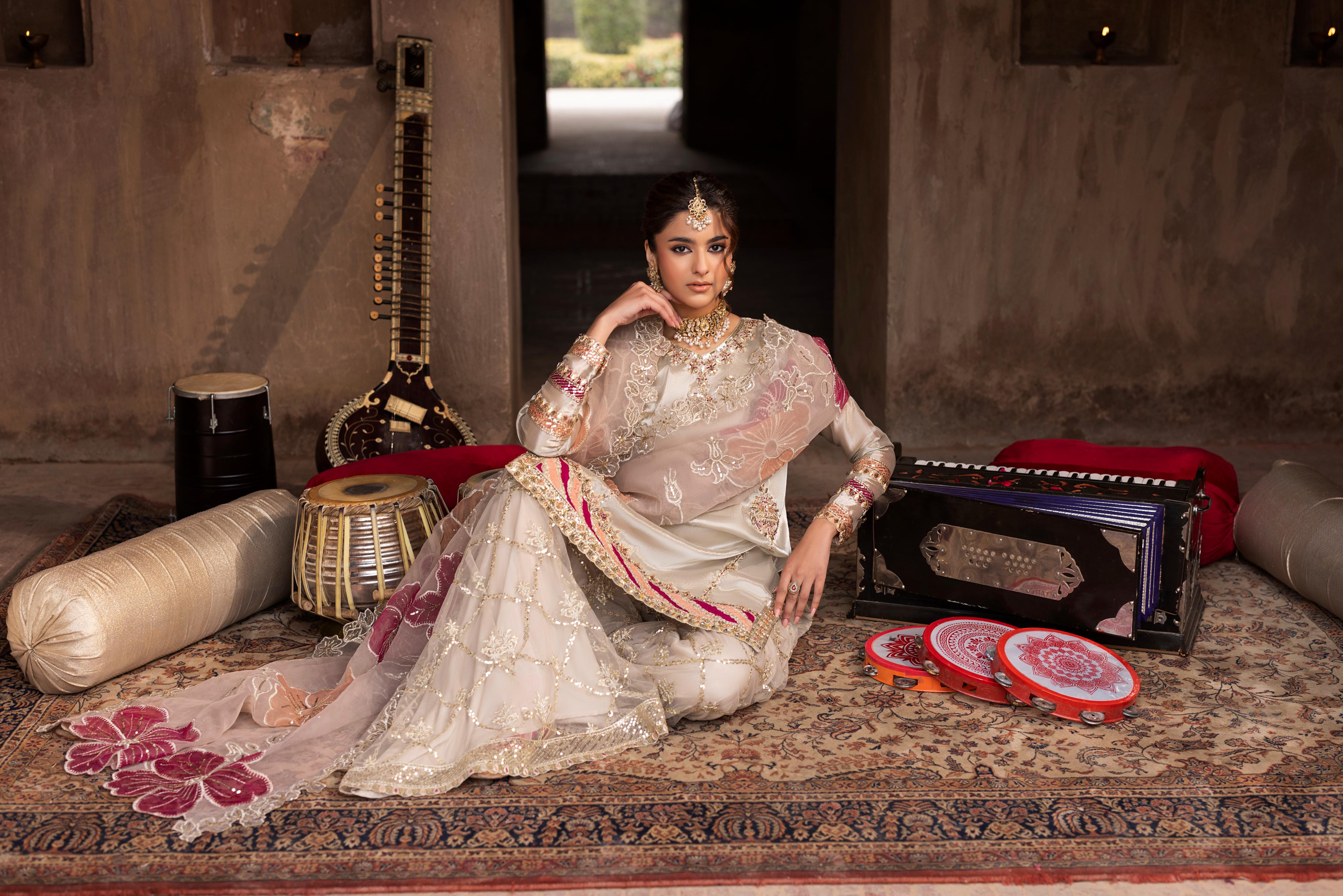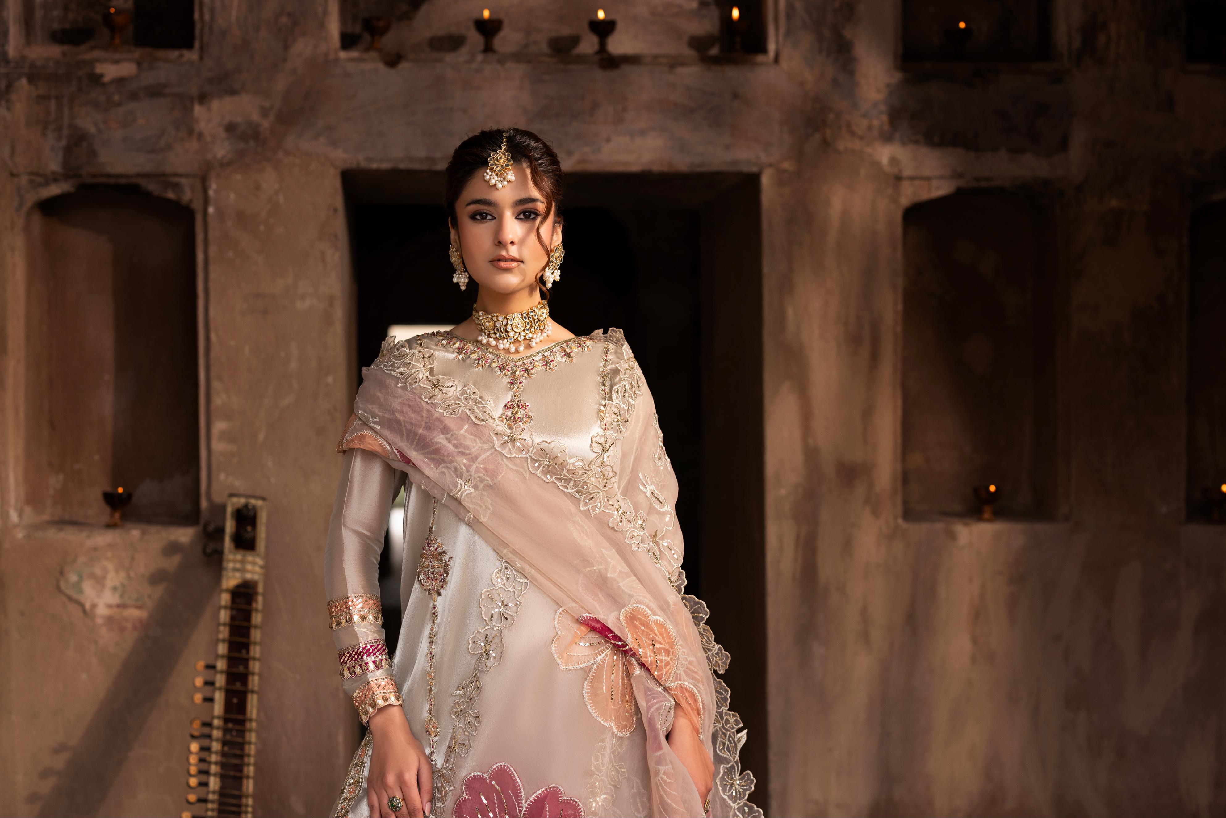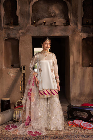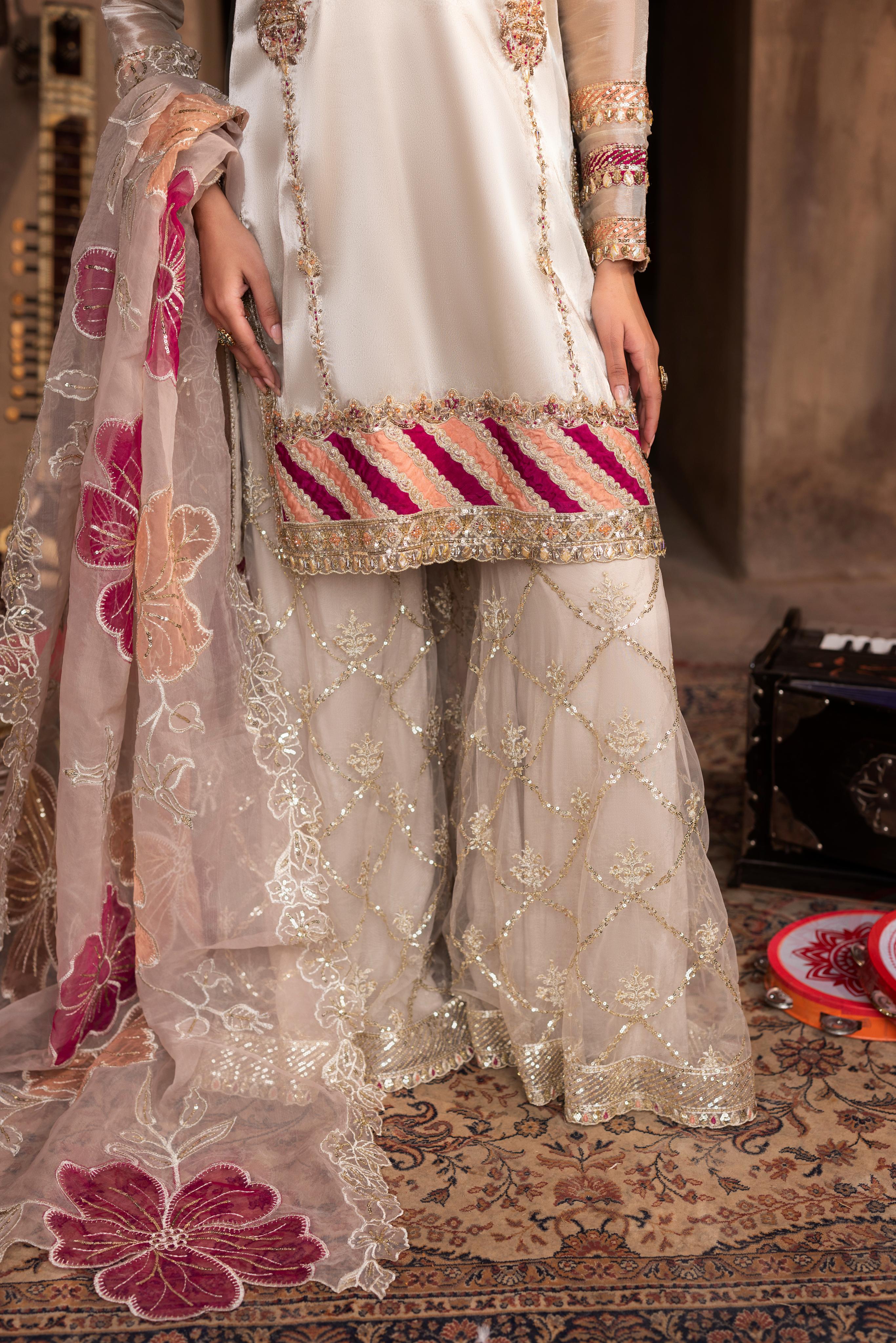 Short Shirt with Sharara paired with Organza duppata, an outfit completes the look with heavy embroidery and embellishment,Lining is Included.
