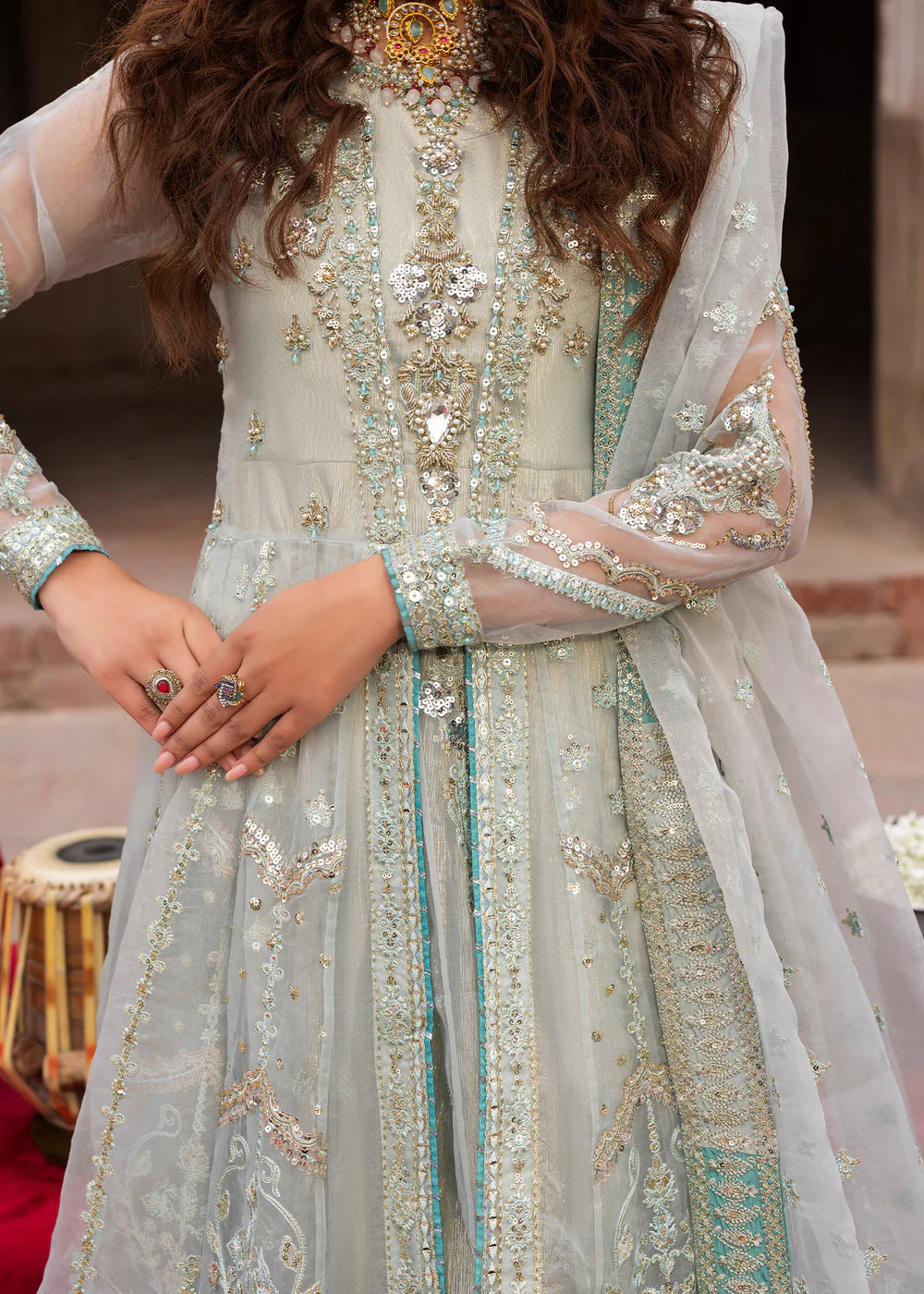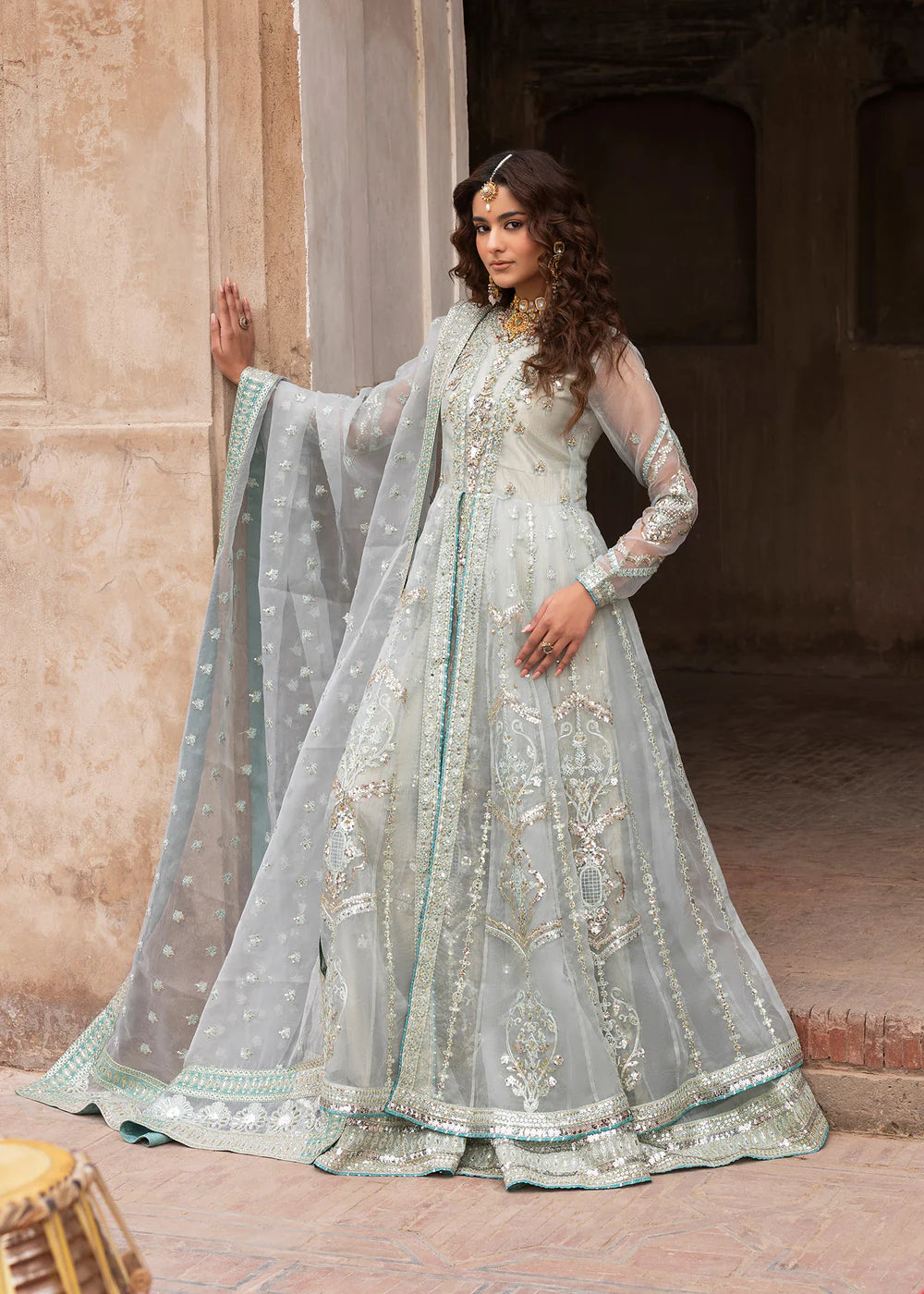 Double layered Maxi with straight pants paired with organza duppata, an outfit completes the look with heavy embroidery and embellishment.