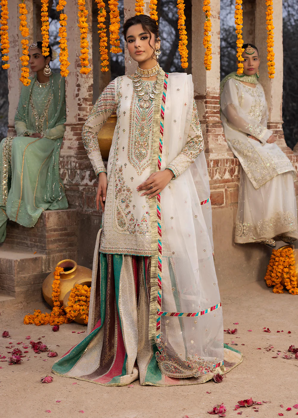 Short Shirt with jamawar garara paired with organza duppata, an outfit completes the look with heavy embroidery and embellishment.