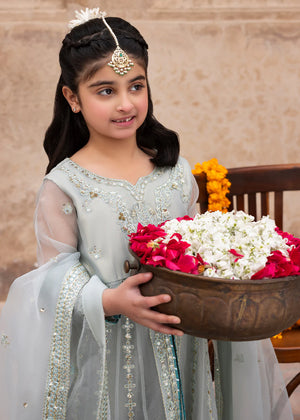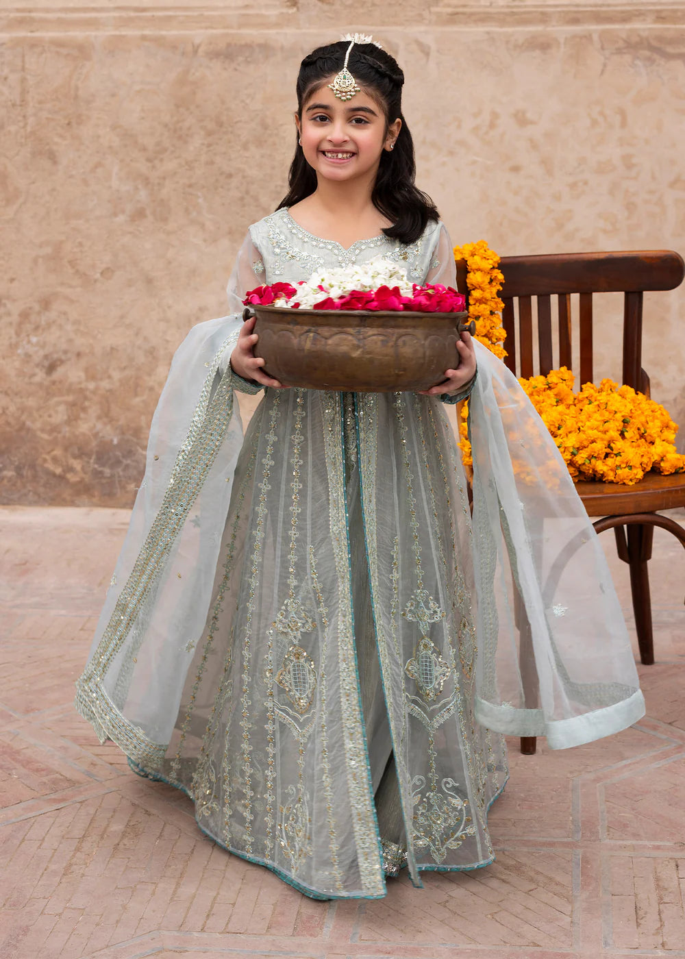 Double layered maxi with straight pants , paired with organza dupatta; this outfit competes the look with embroidery