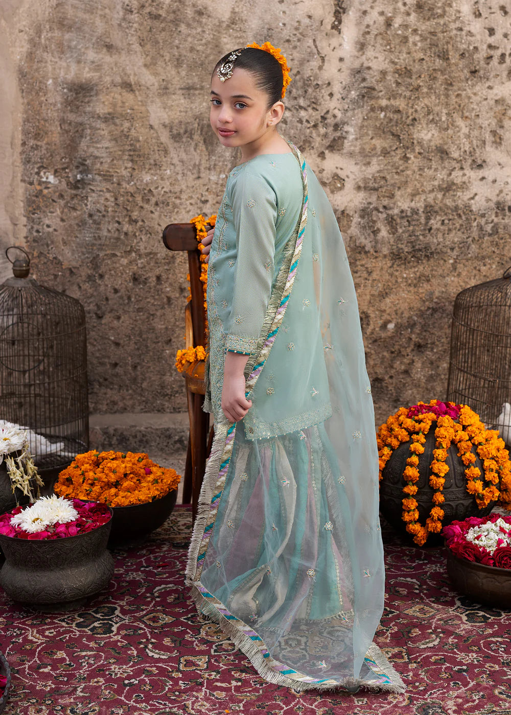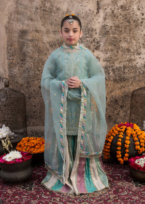 Short length Shirt with garara, paired with organza dupatta; this outfit competes the look with embroidery