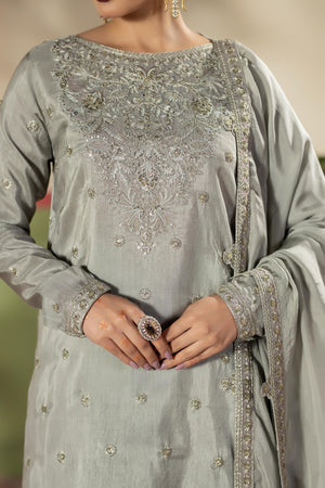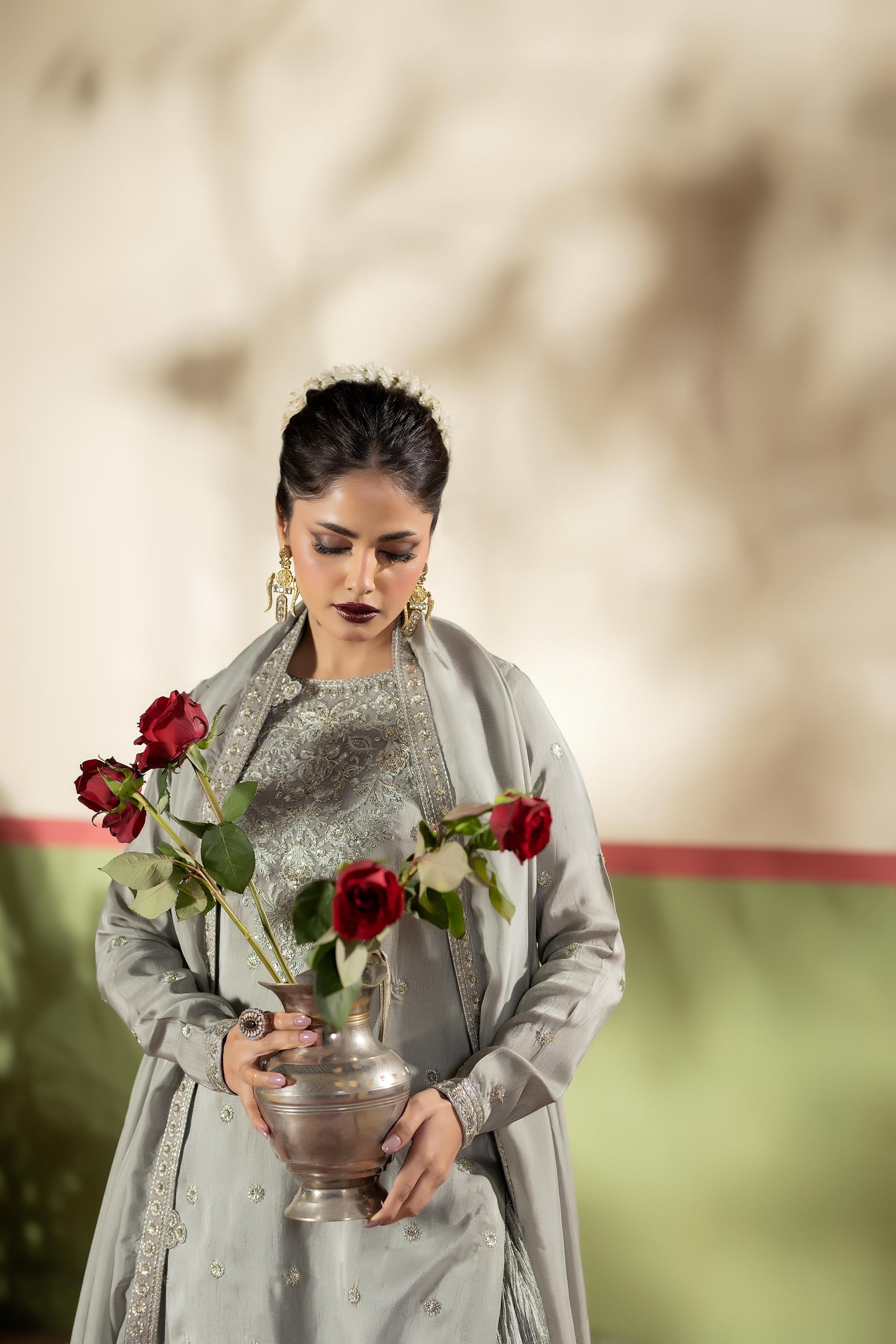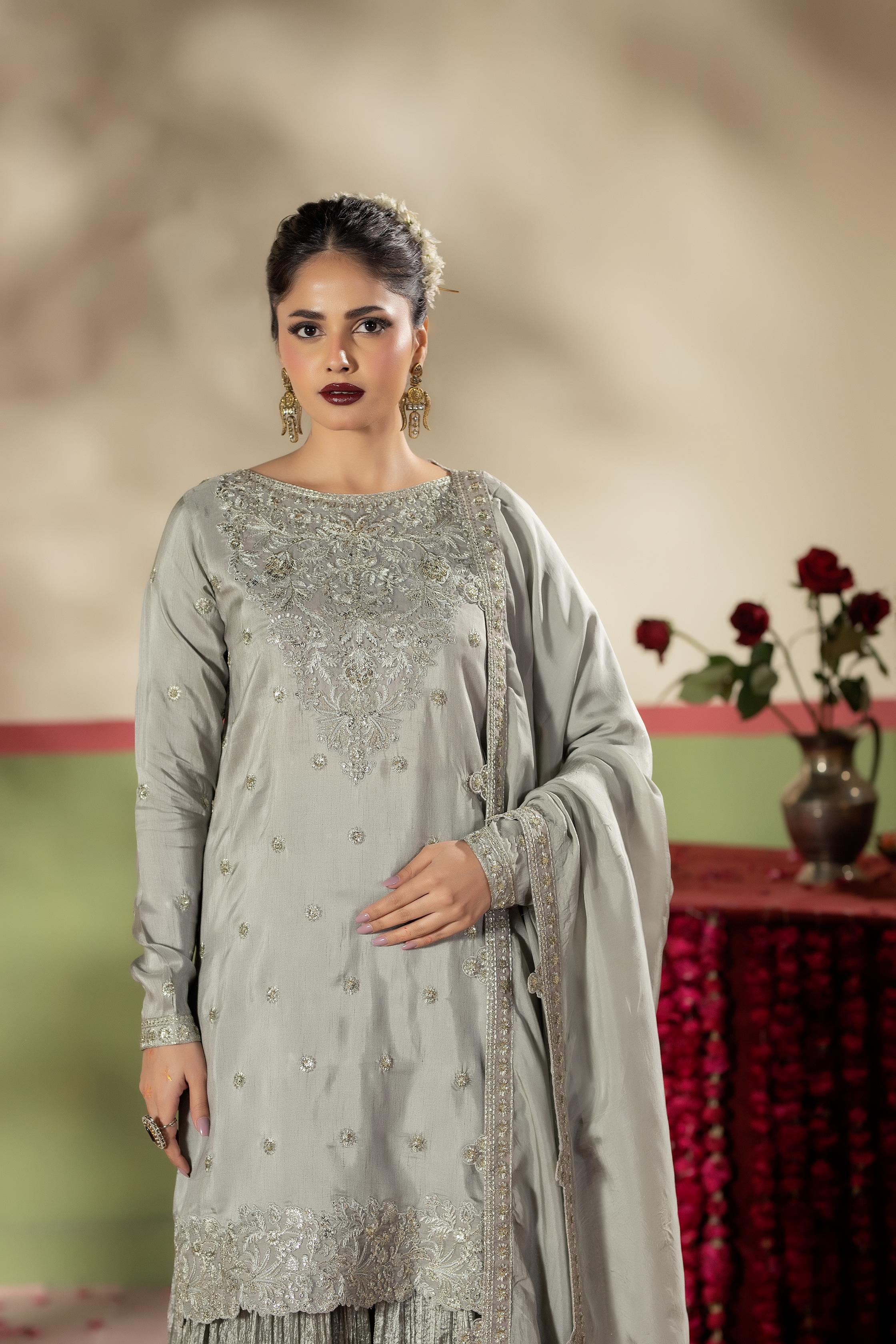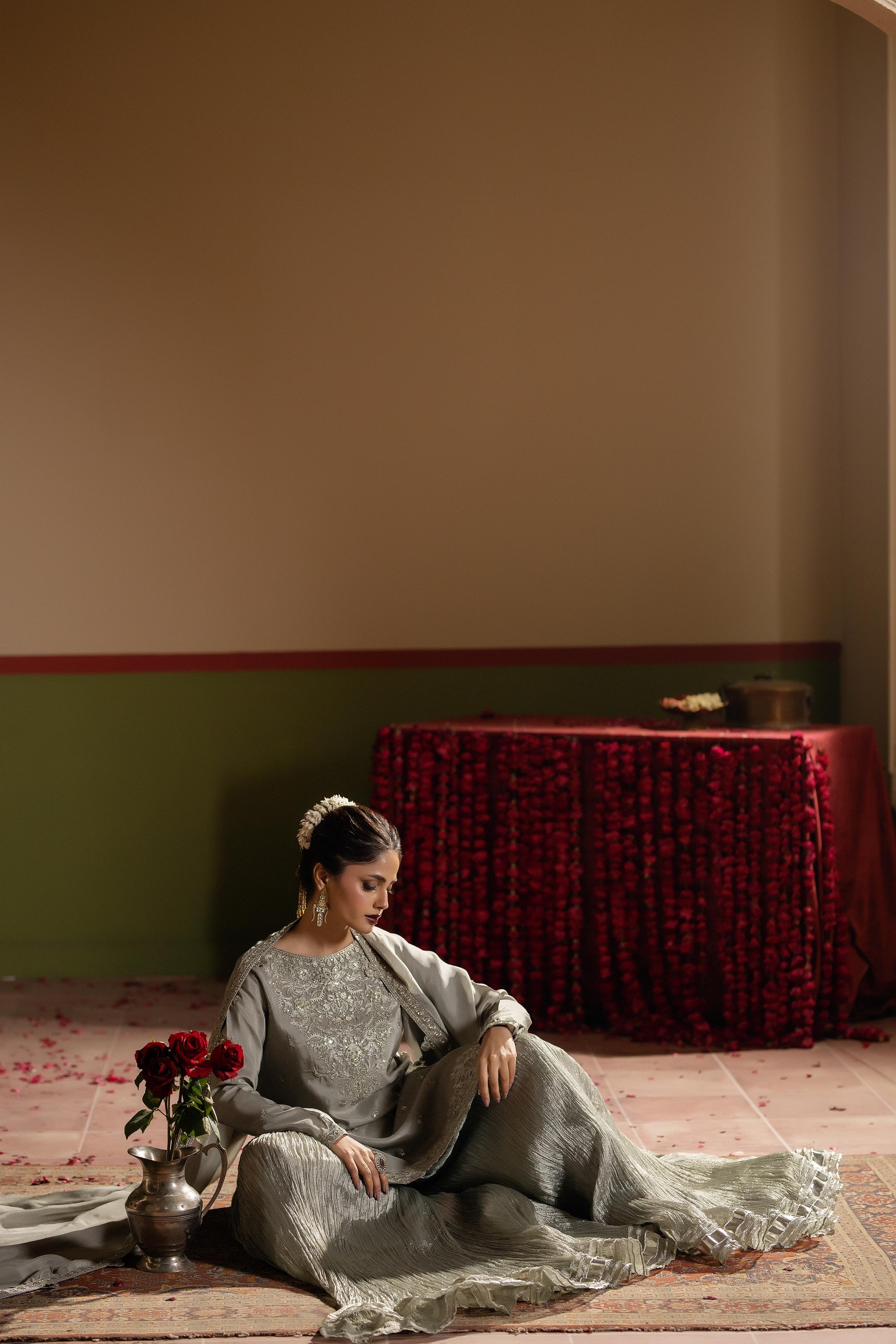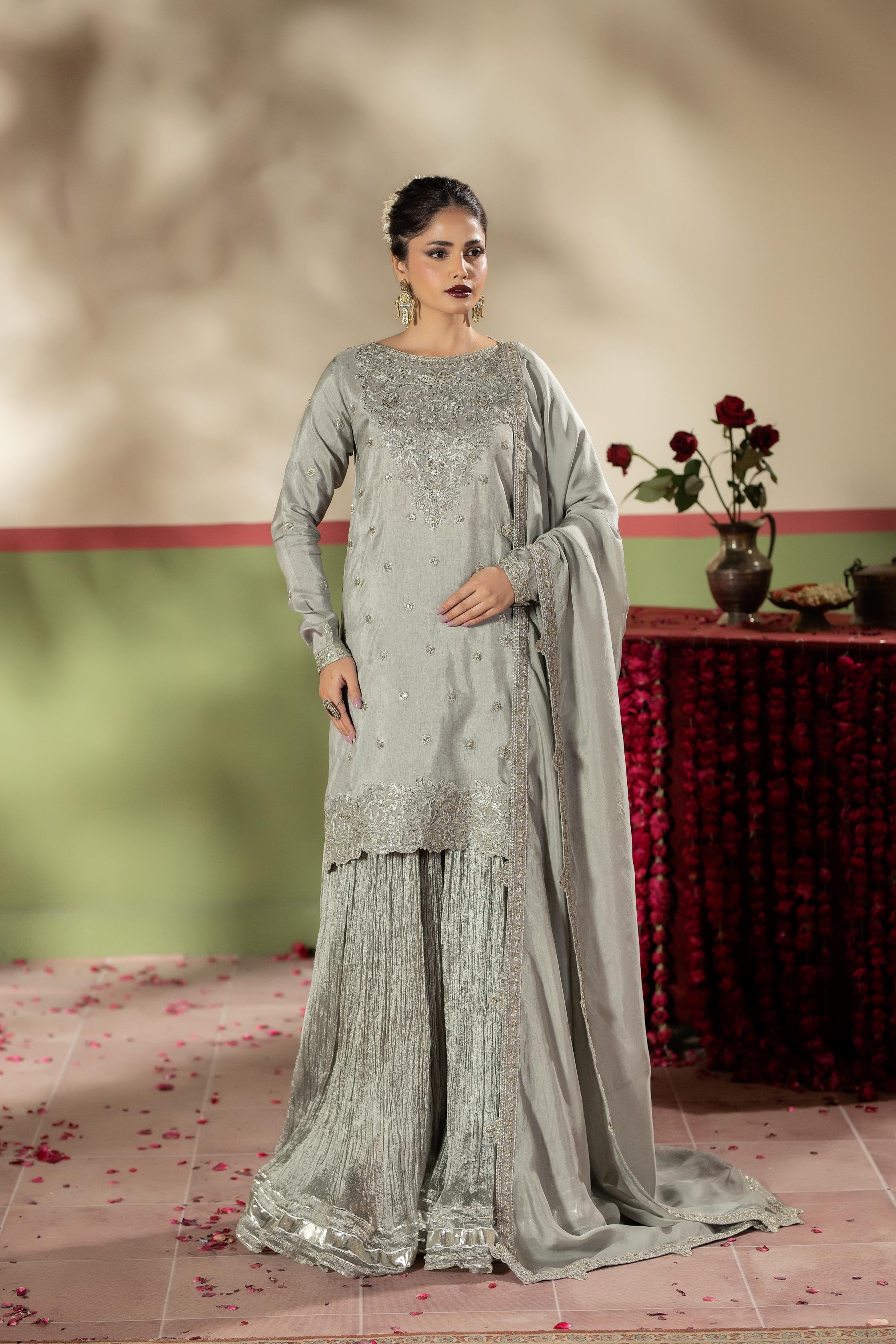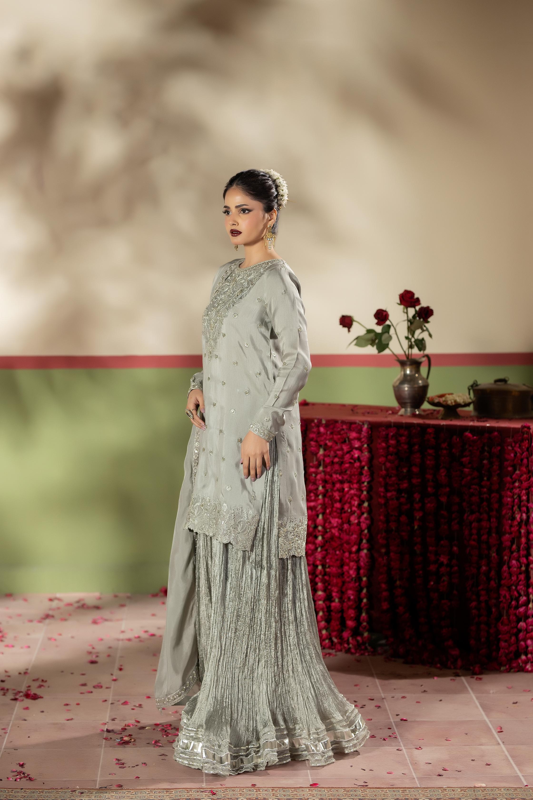 Short shirt with Crushed Sharara paired with Medium silk duppata, an outfit completes the look with heavy embroidery.