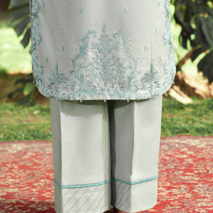 Long Length Shirt with straight trouser, paired with organza dupatta; this outfit competes the look with embroidery and organza patch work