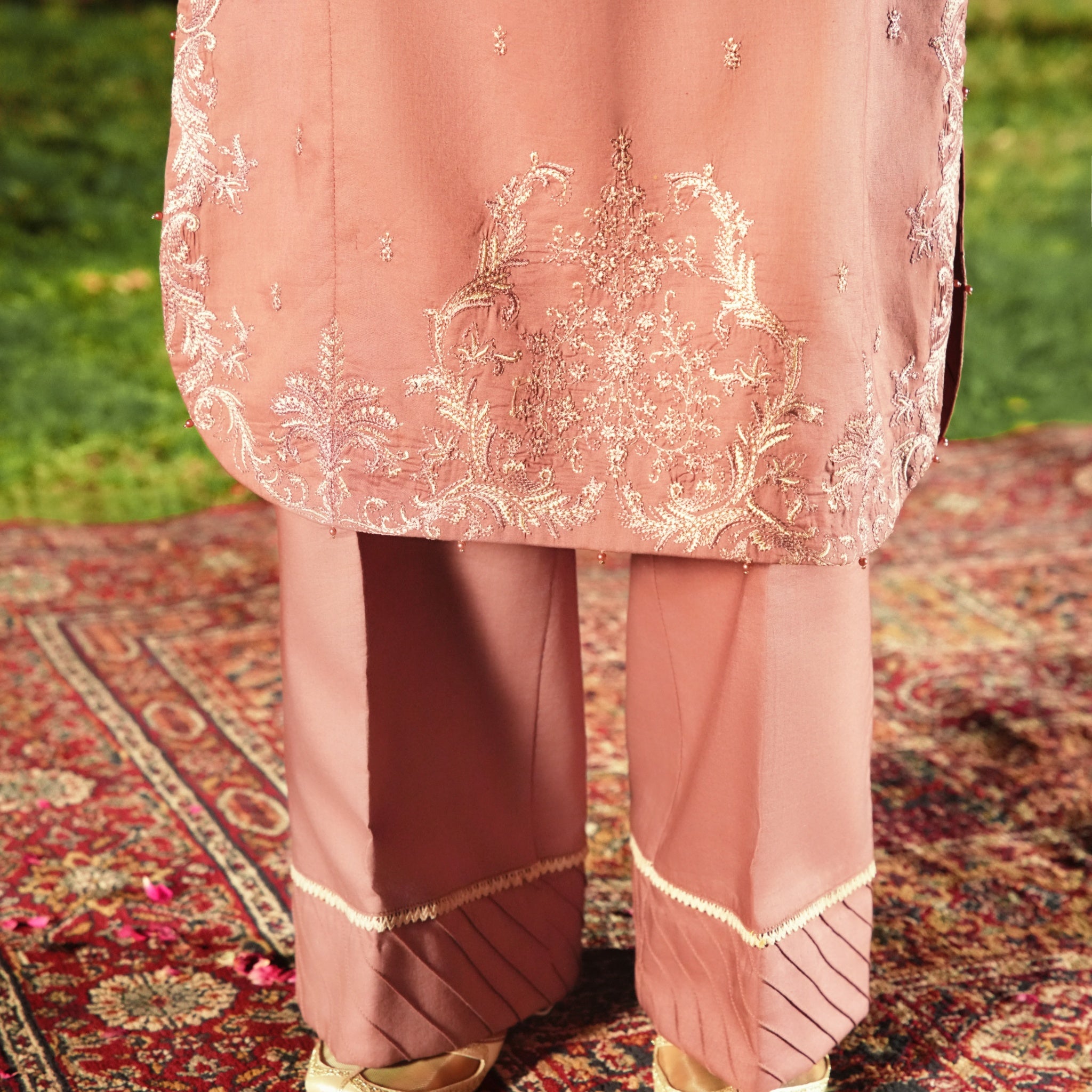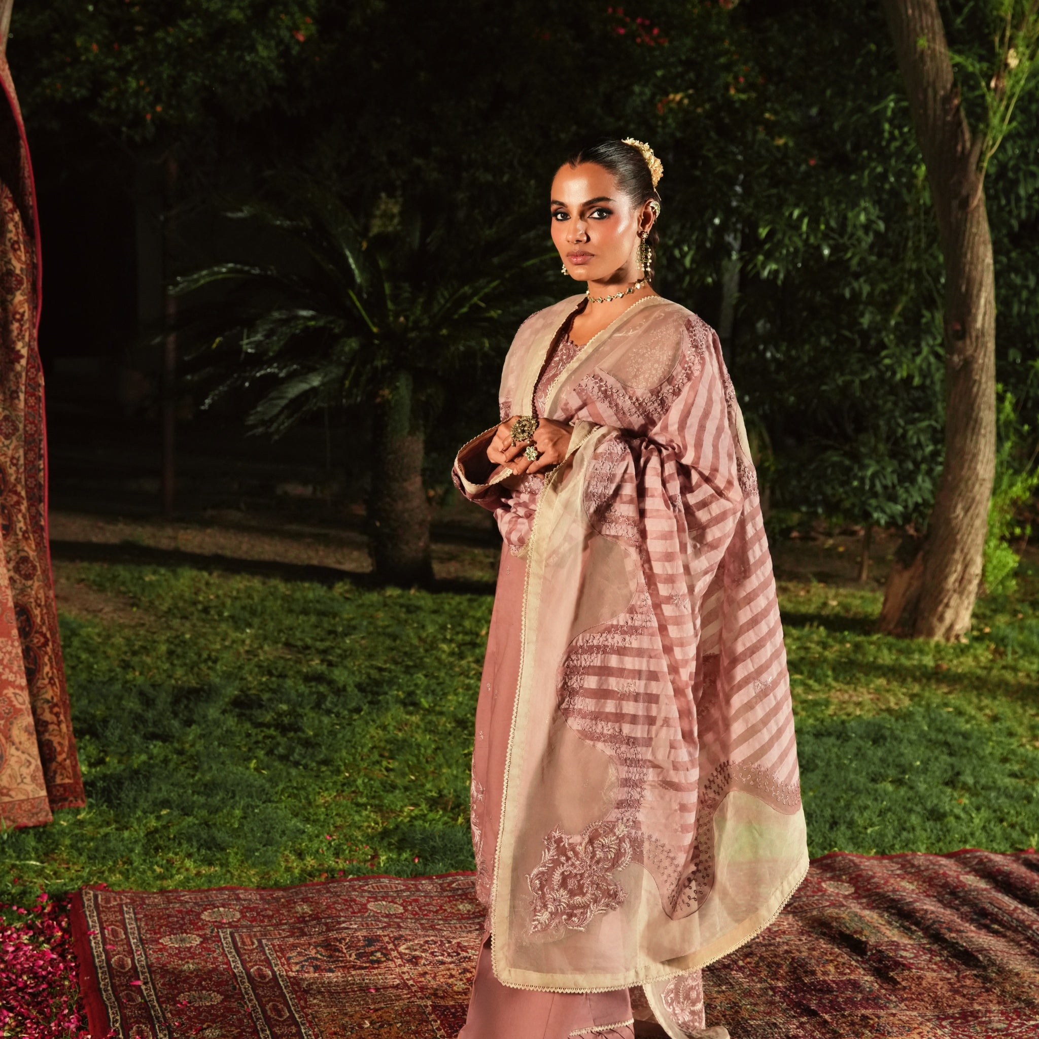 Long Length Shirt with straight trouser, paired with organza dupatta; this outfit competes the look with embroidery and organza patch work