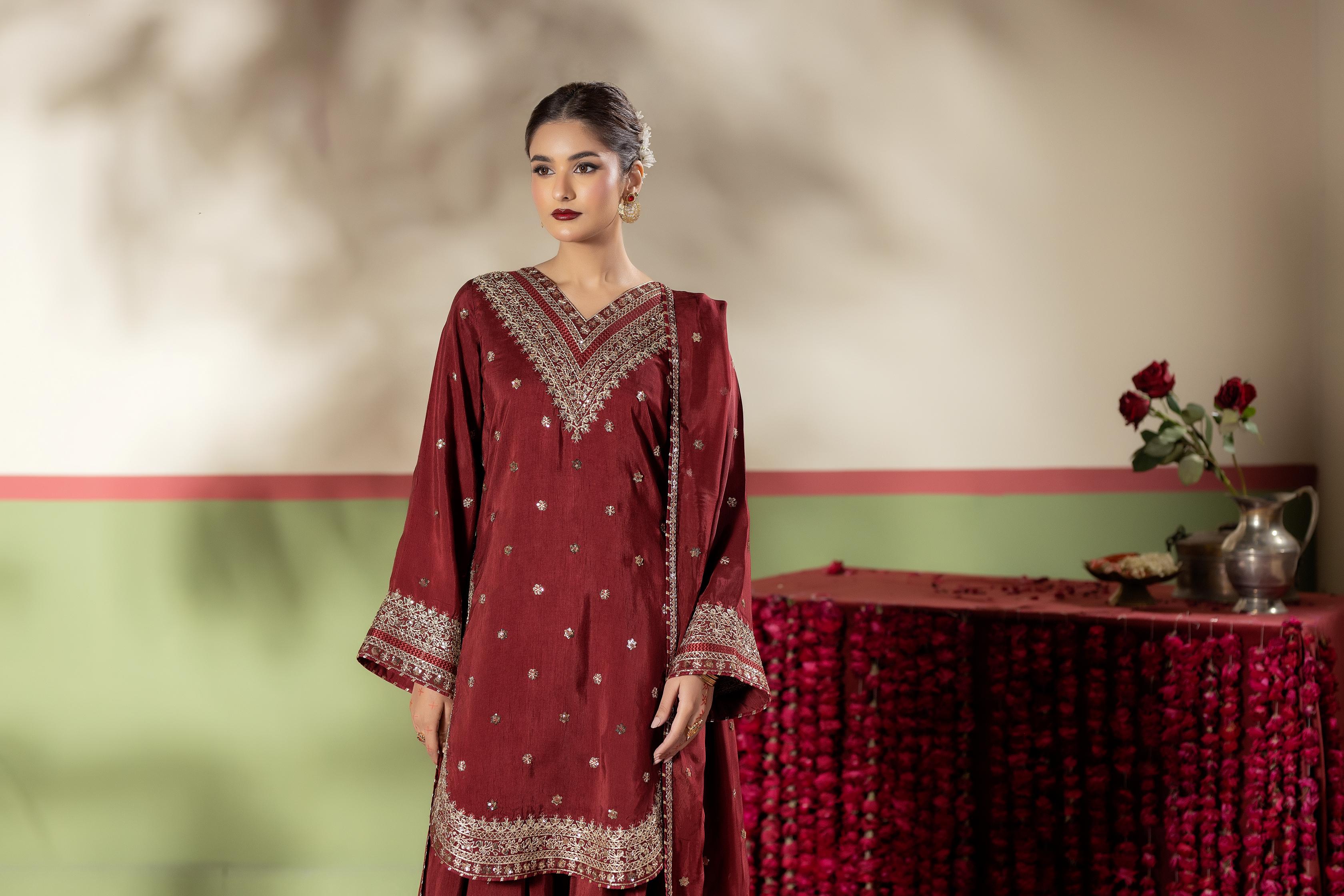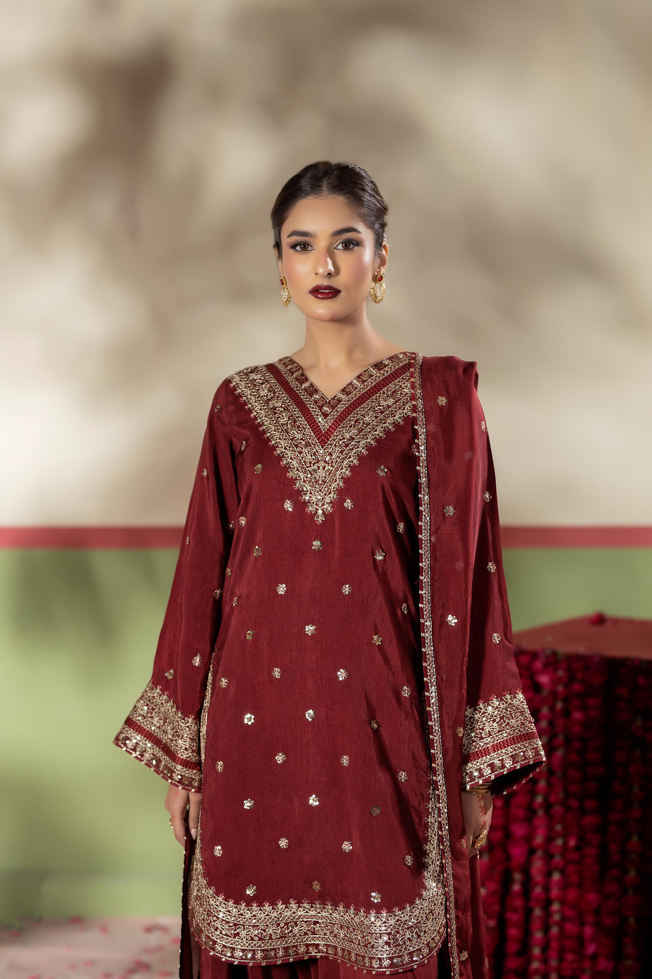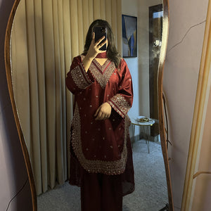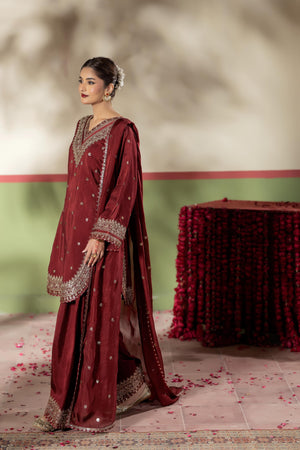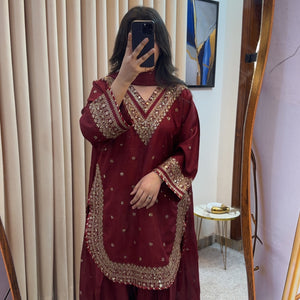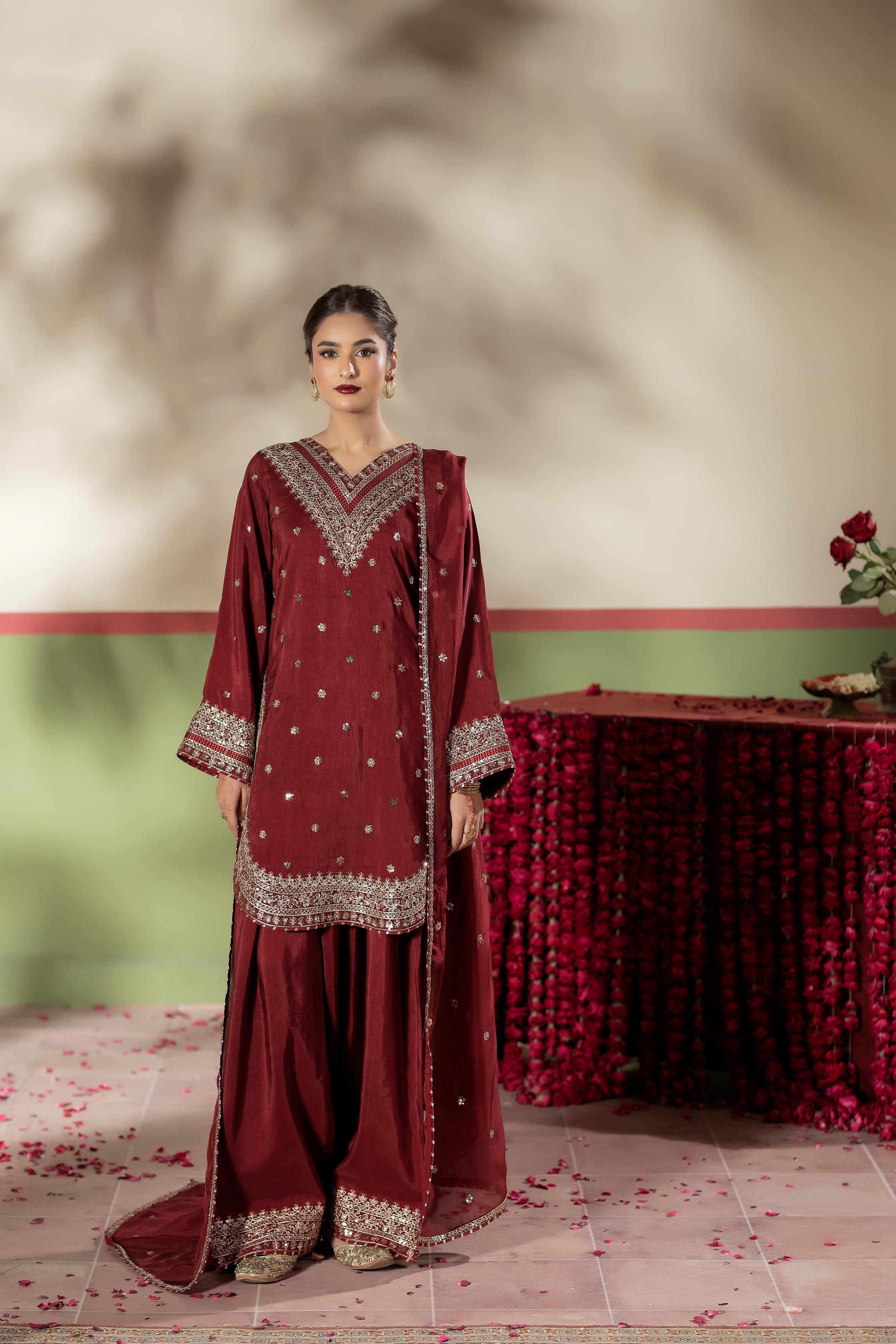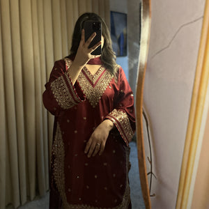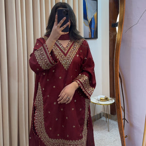Short shirt with farshi shalwar paired with Medium silk duppata, an outfit completes the look with heavy embroidery.