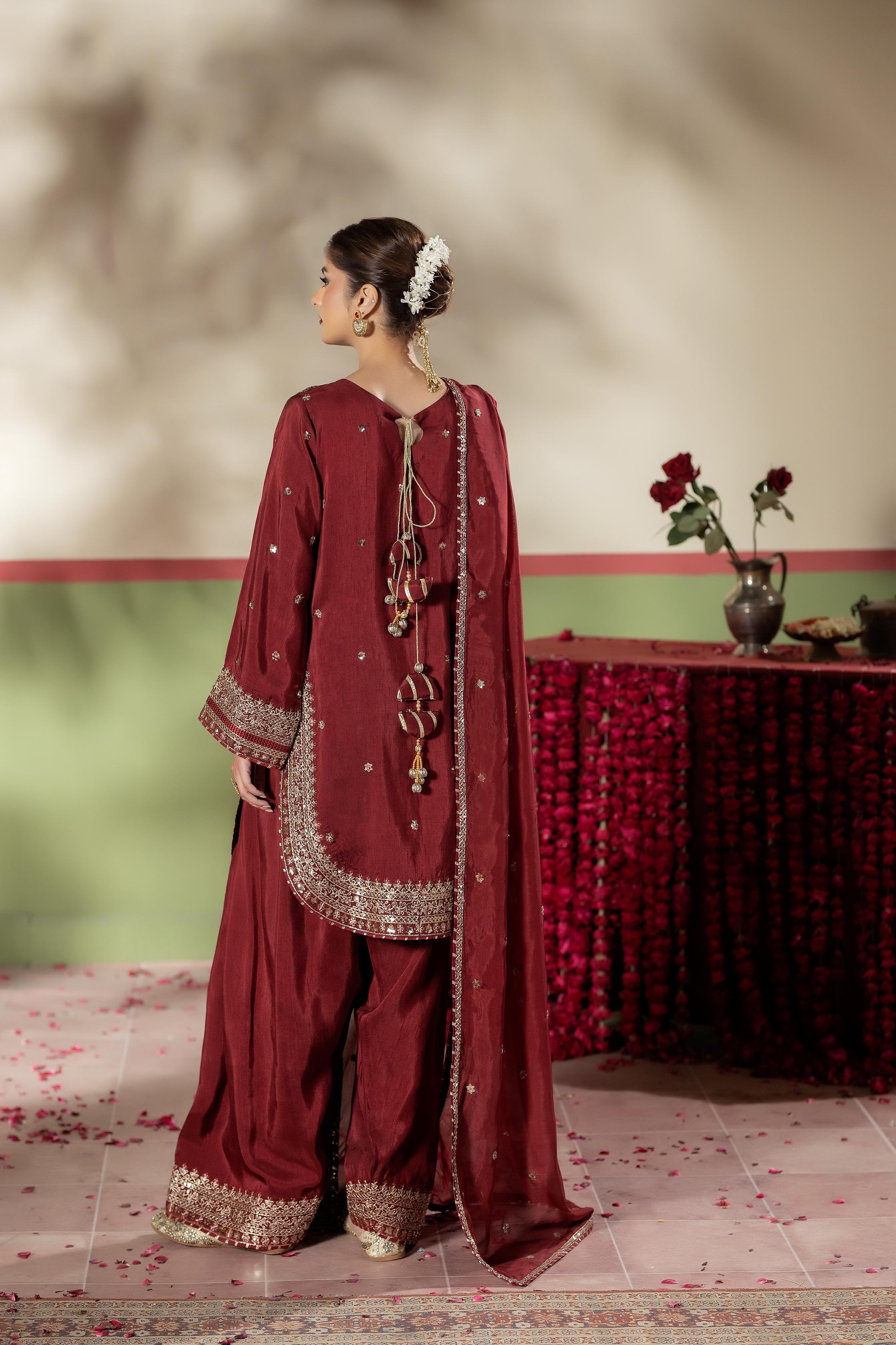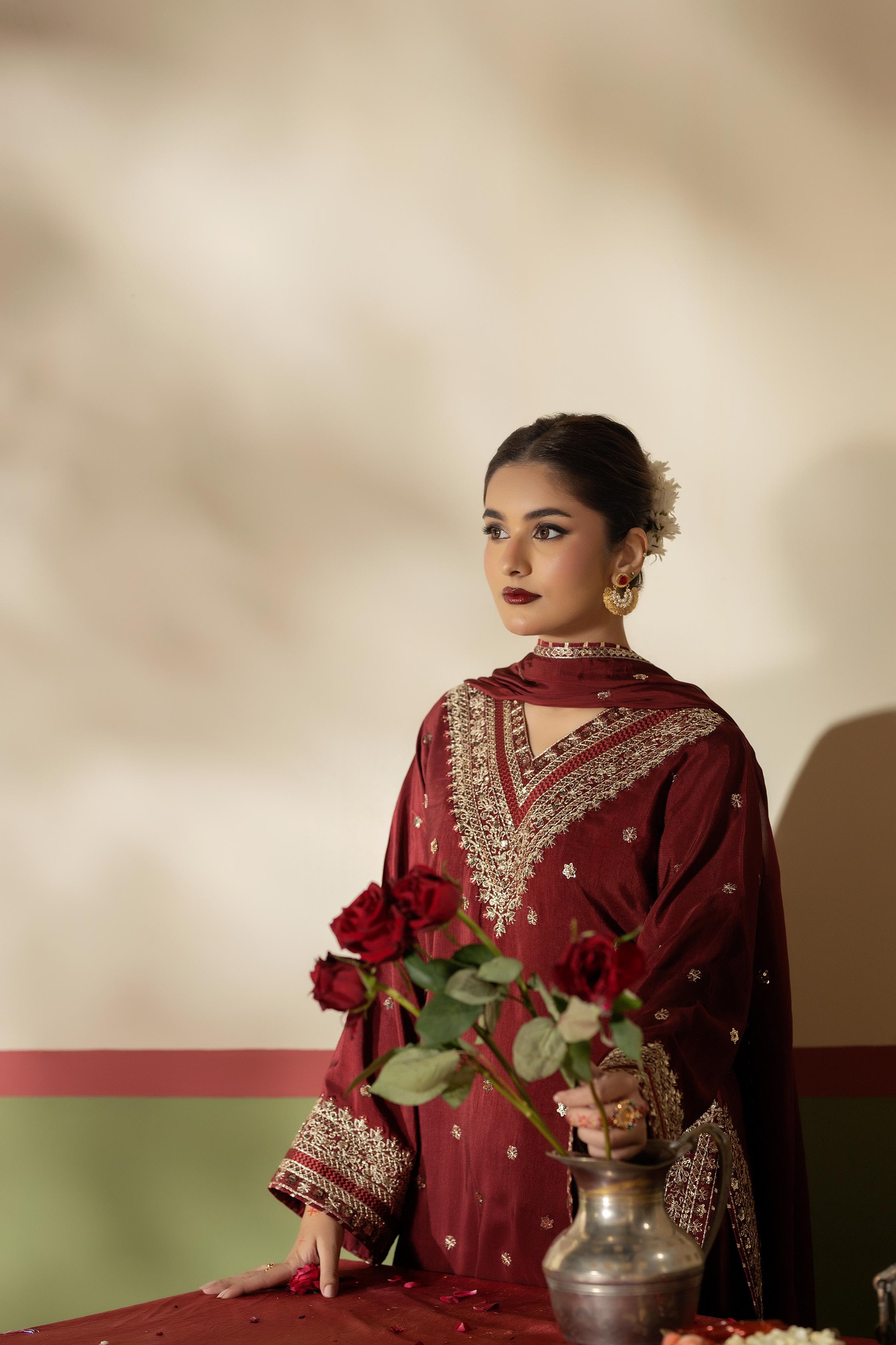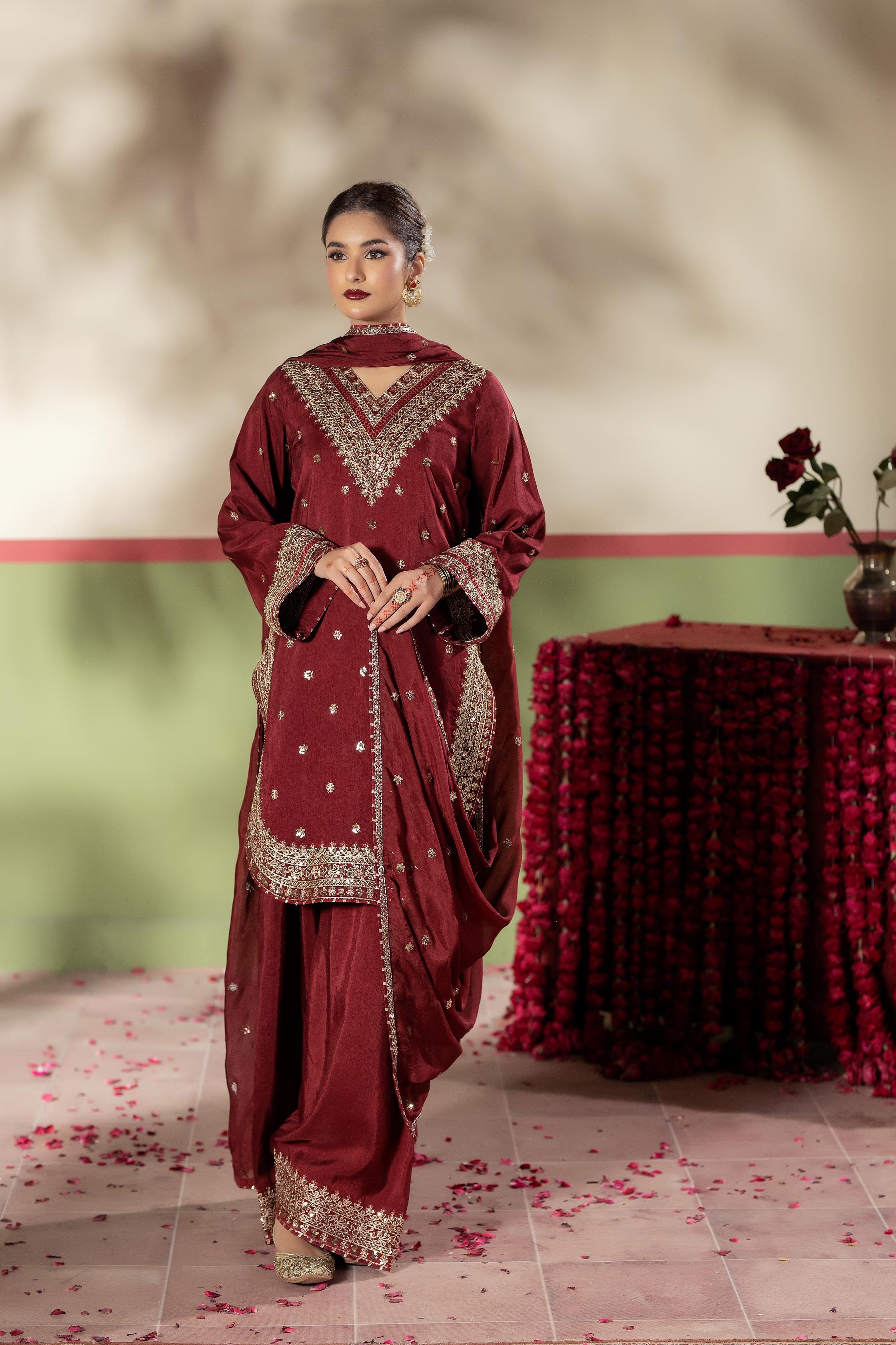 Short shirt with farshi shalwar paired with Medium silk duppata, an outfit completes the look with heavy embroidery.