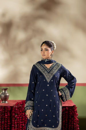 Short shirt with farshi shalwar paired with Medium silk duppata, an outfit completes the look with heavy embroidery.