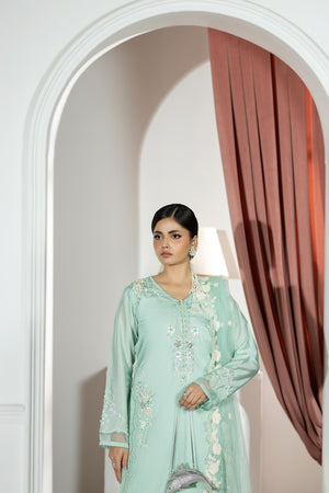 Medium shirt with straight pants paired with net duppata, an outfit completes the look with heavy embroidery & embellishment.