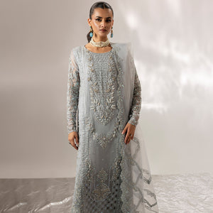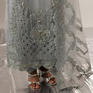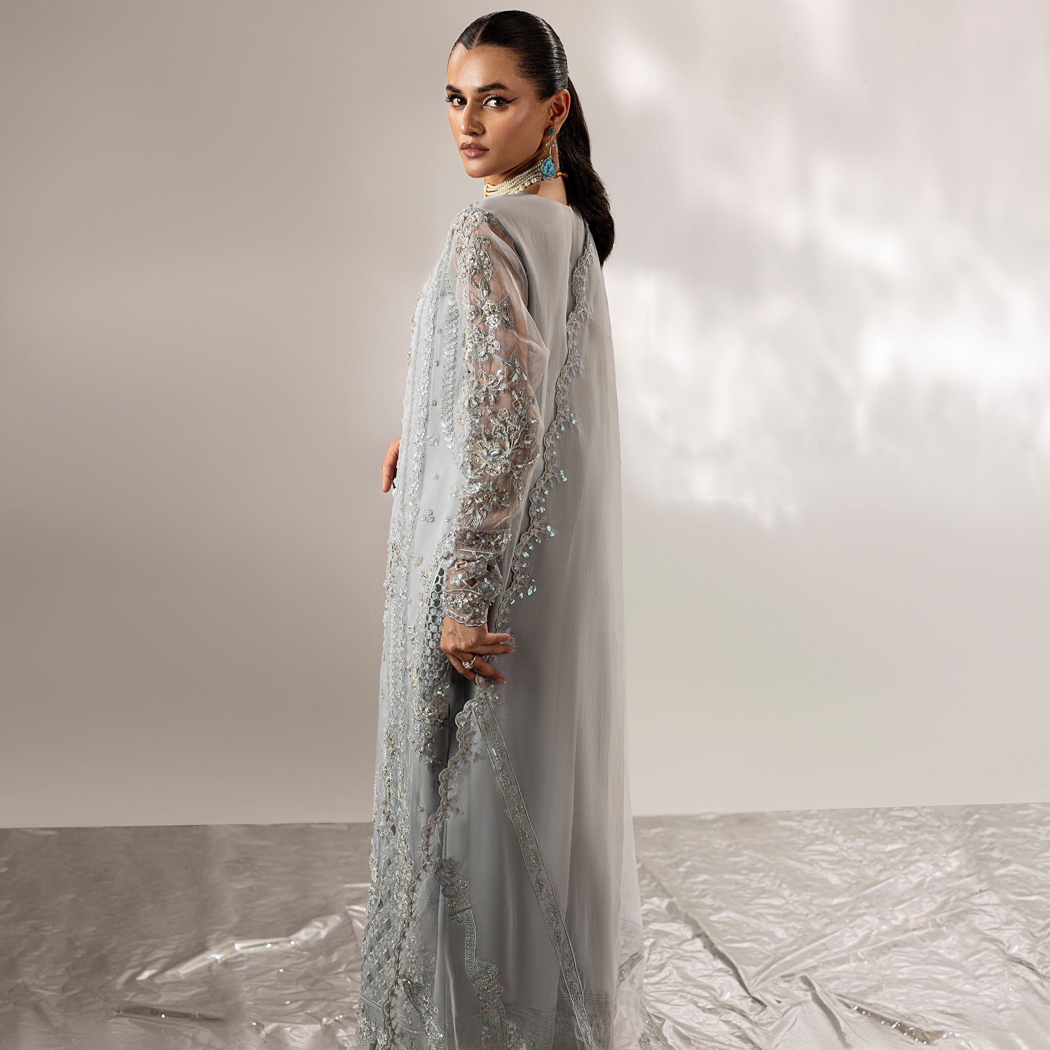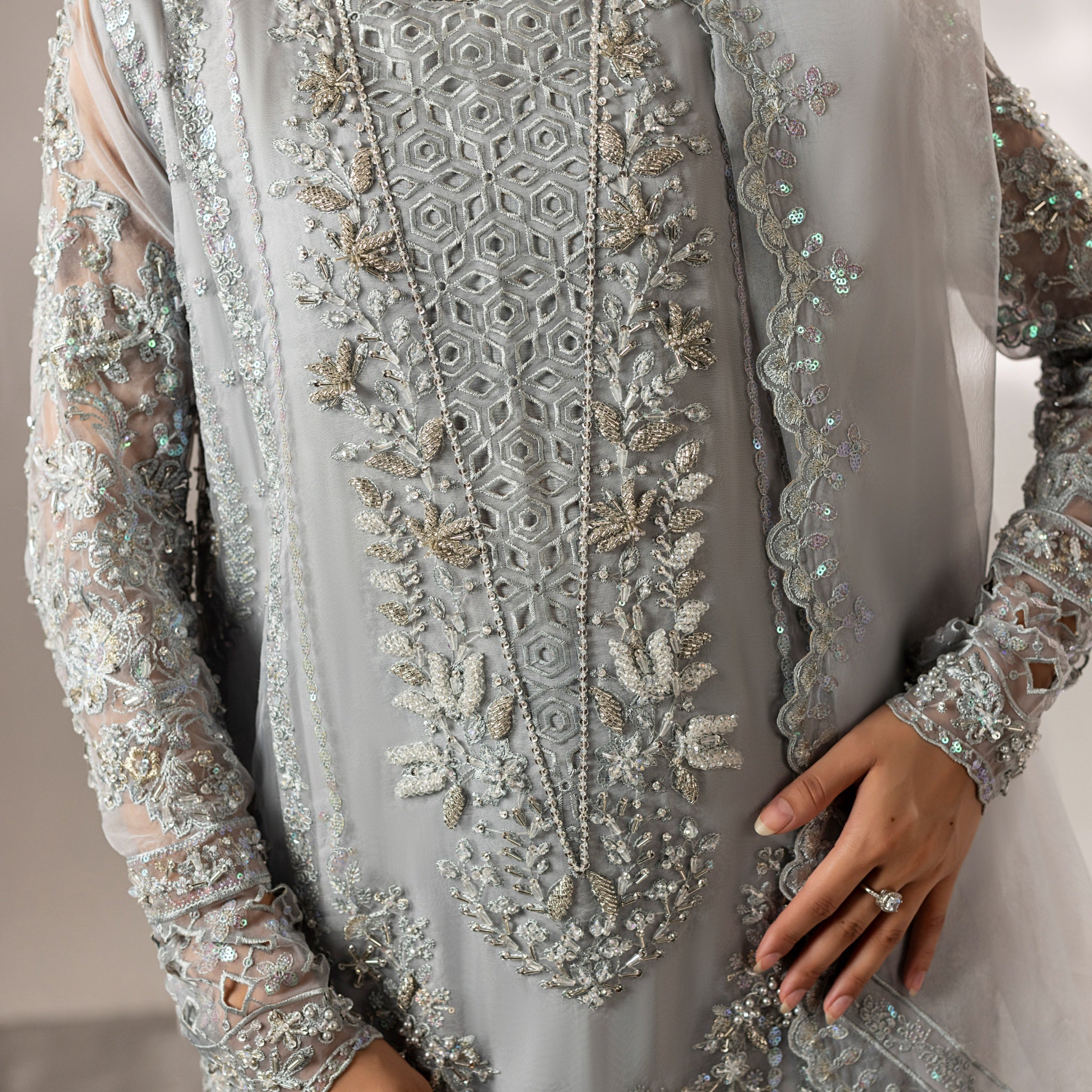 Long length shirt with straight trouser, paired with organza dupatta; this outfit competes the look with embroidery and heavy embellishment.