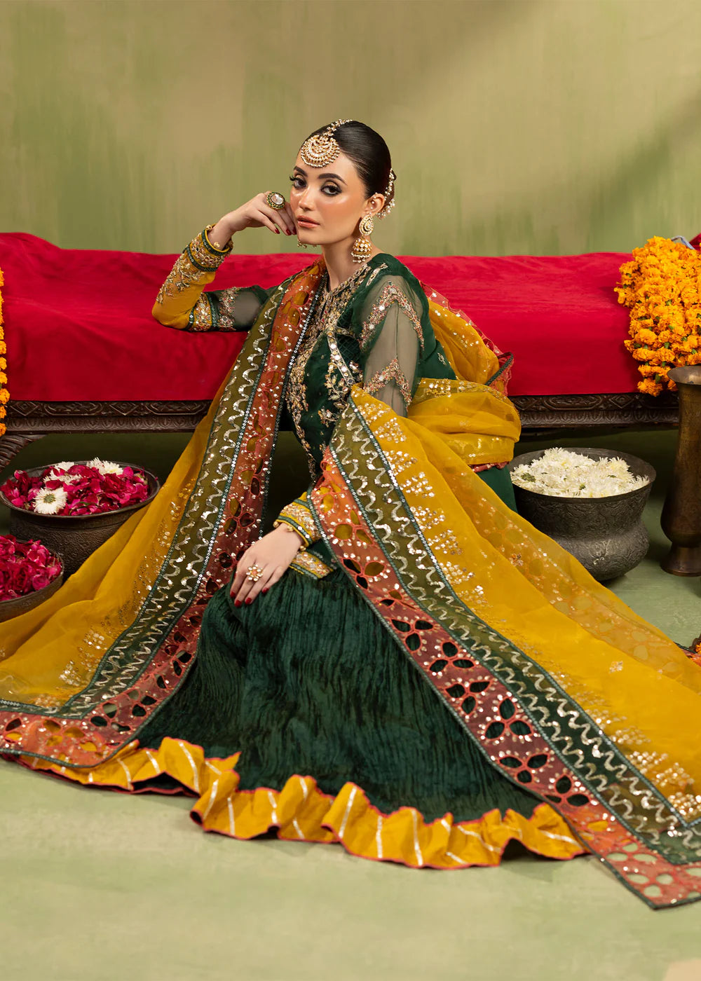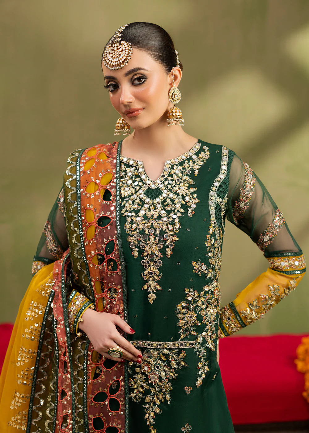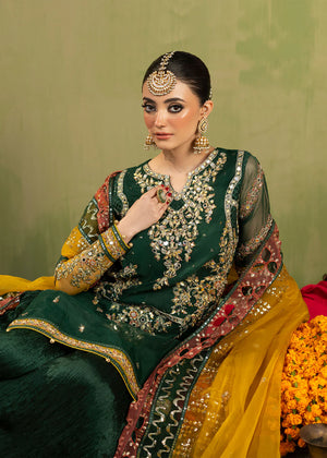 Short Shirt with crushed gharara paired with Organza duppata, an outfit completes the look with heavy embroidery and embellishment.