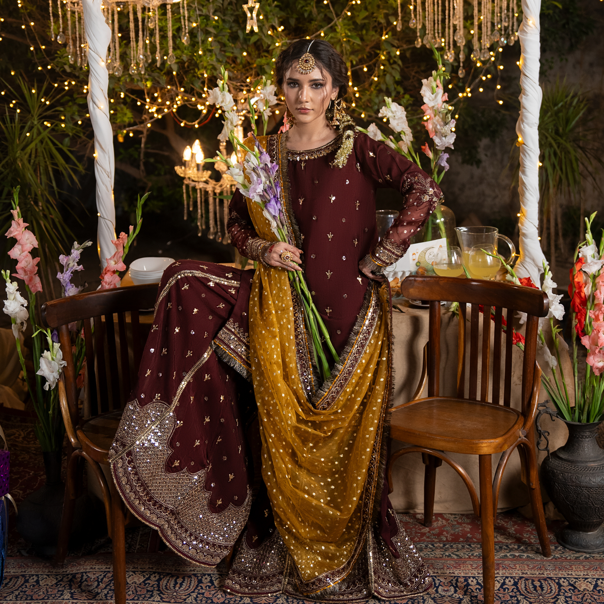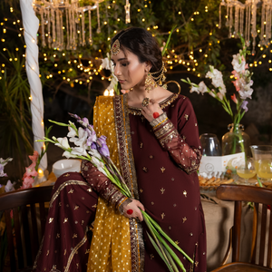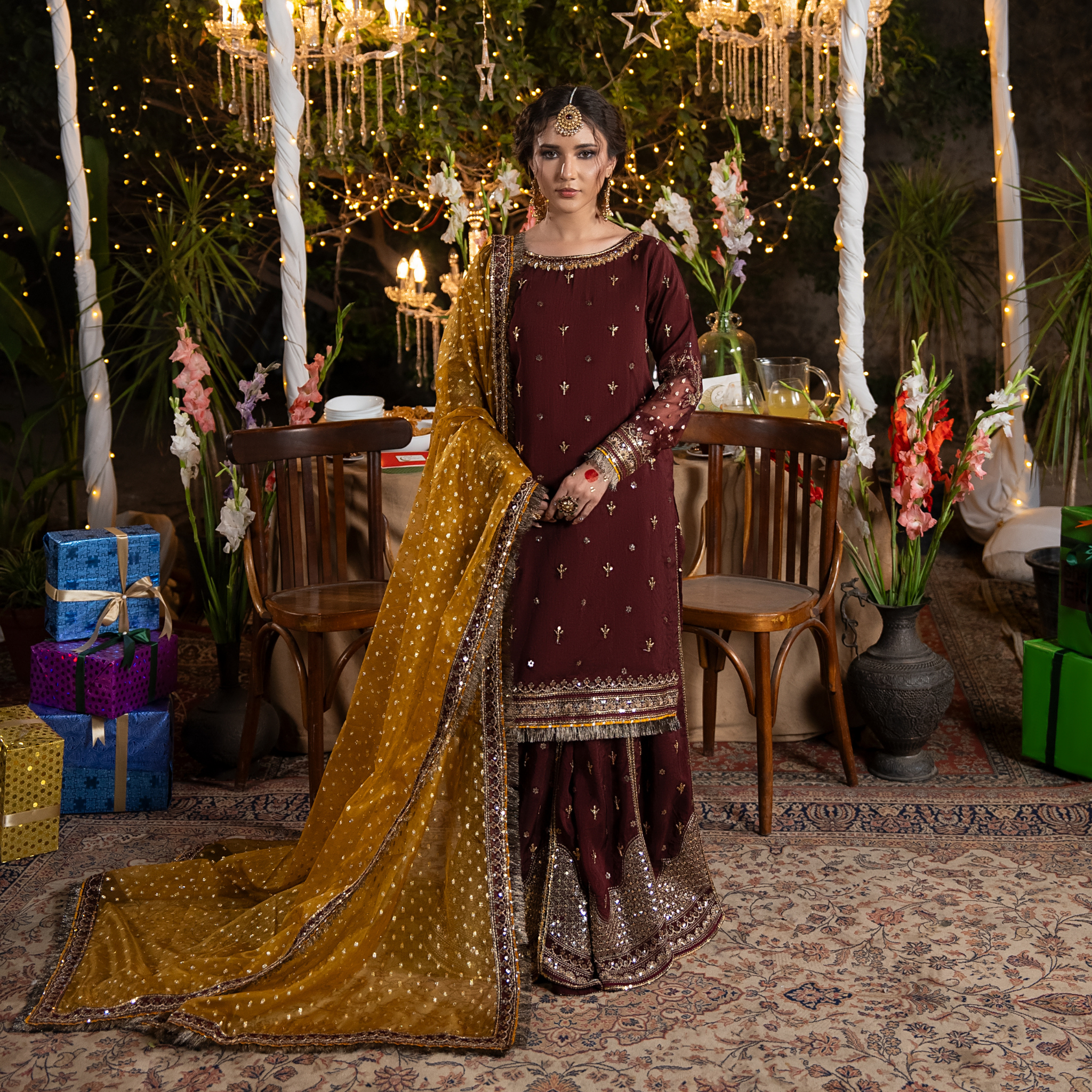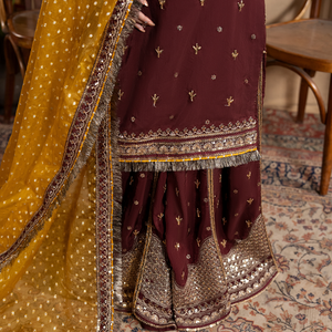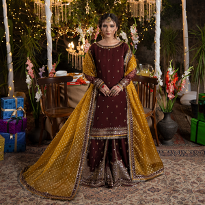 Short shirt with sharara paired with bindi organza duppata, an outfit completes the look with heavy embroidery and embellishment.