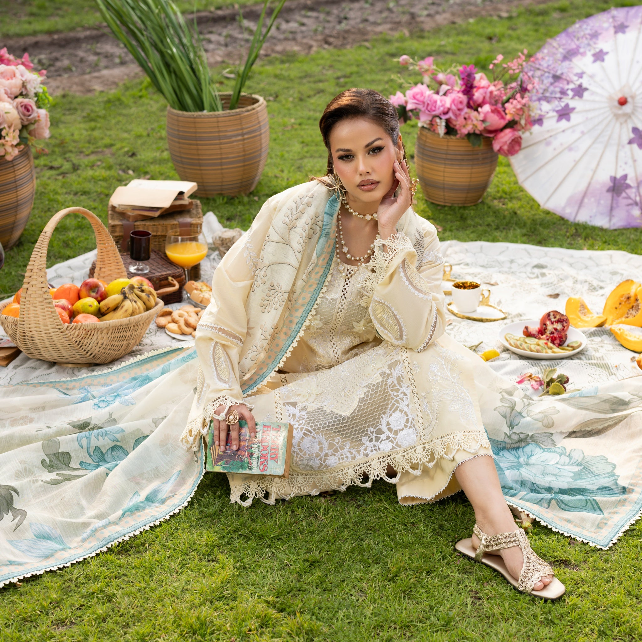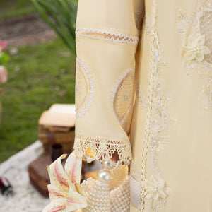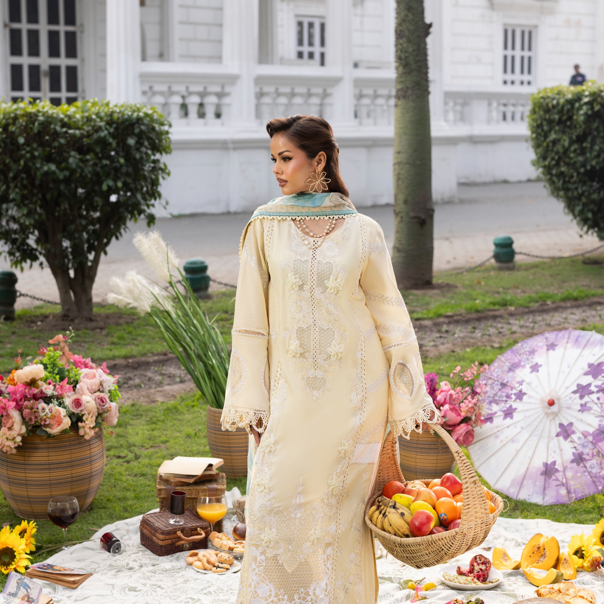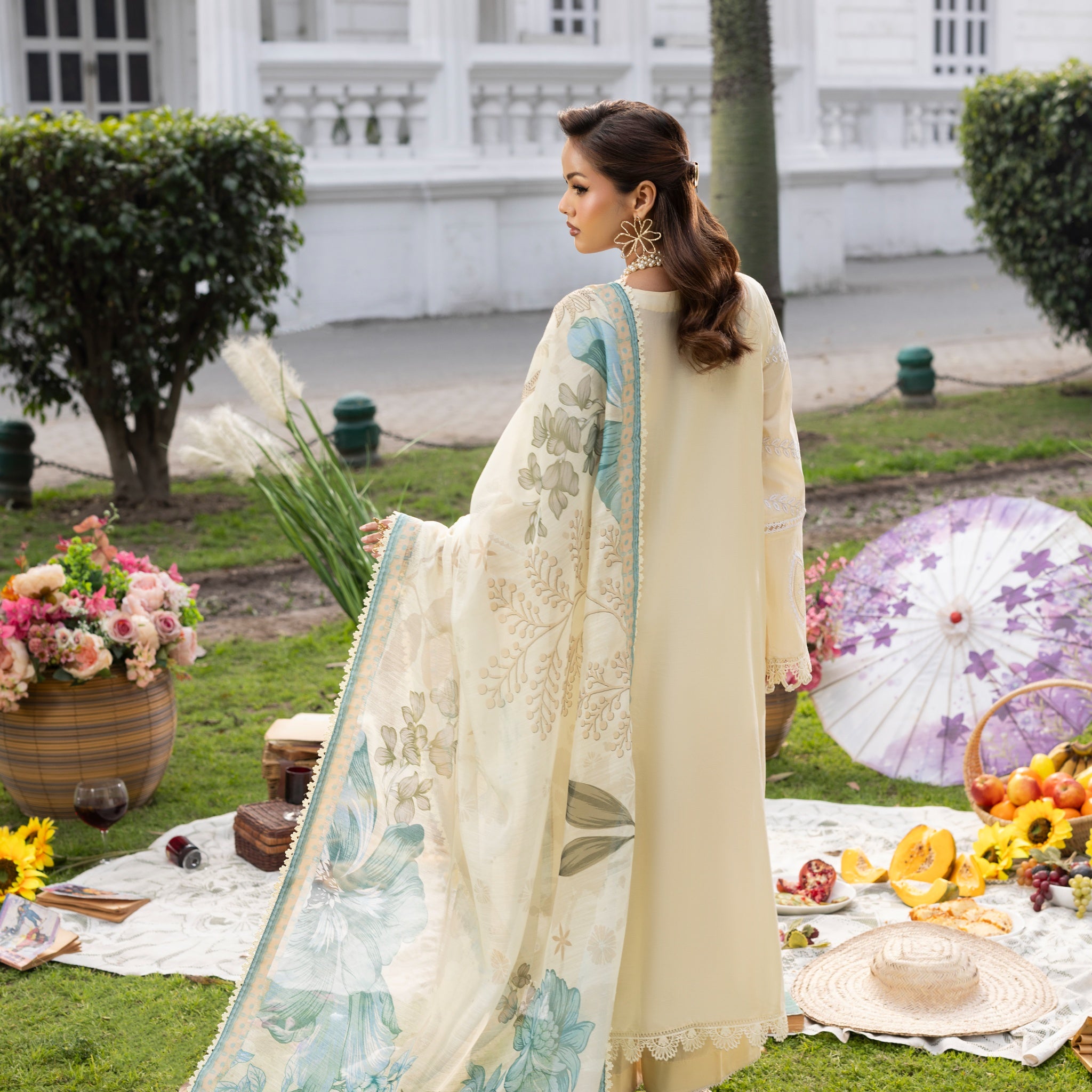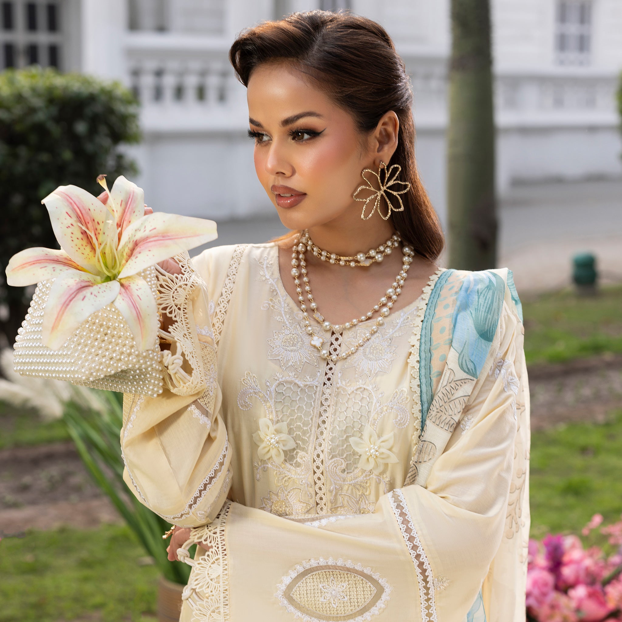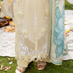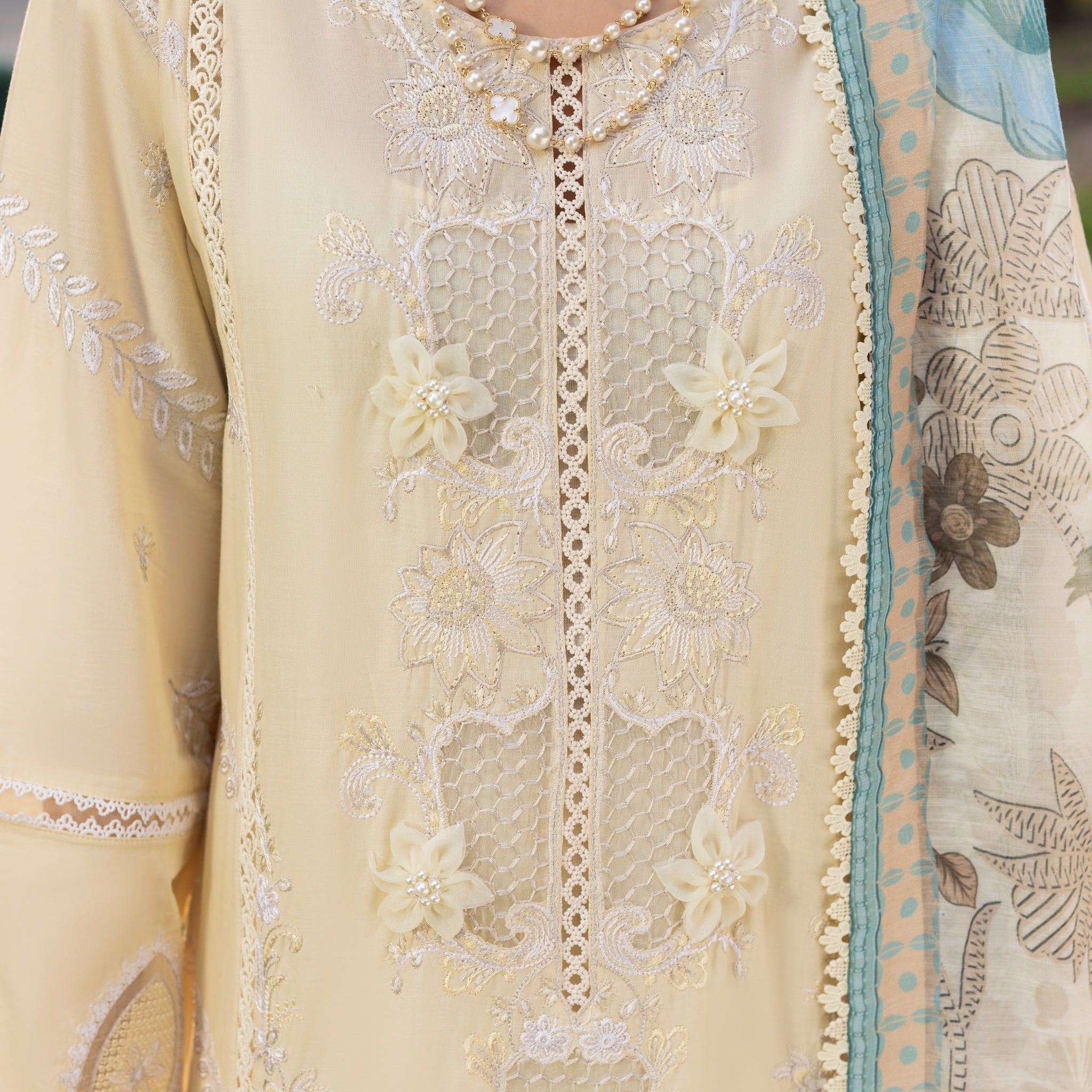 Long Length  Shirt with straight trouser, paired with printed dupatta; this outfit competes the look with embroidery and organza patch work