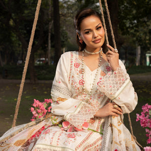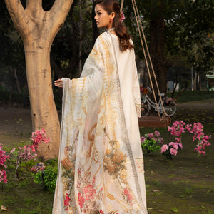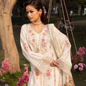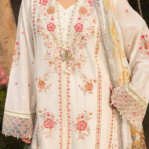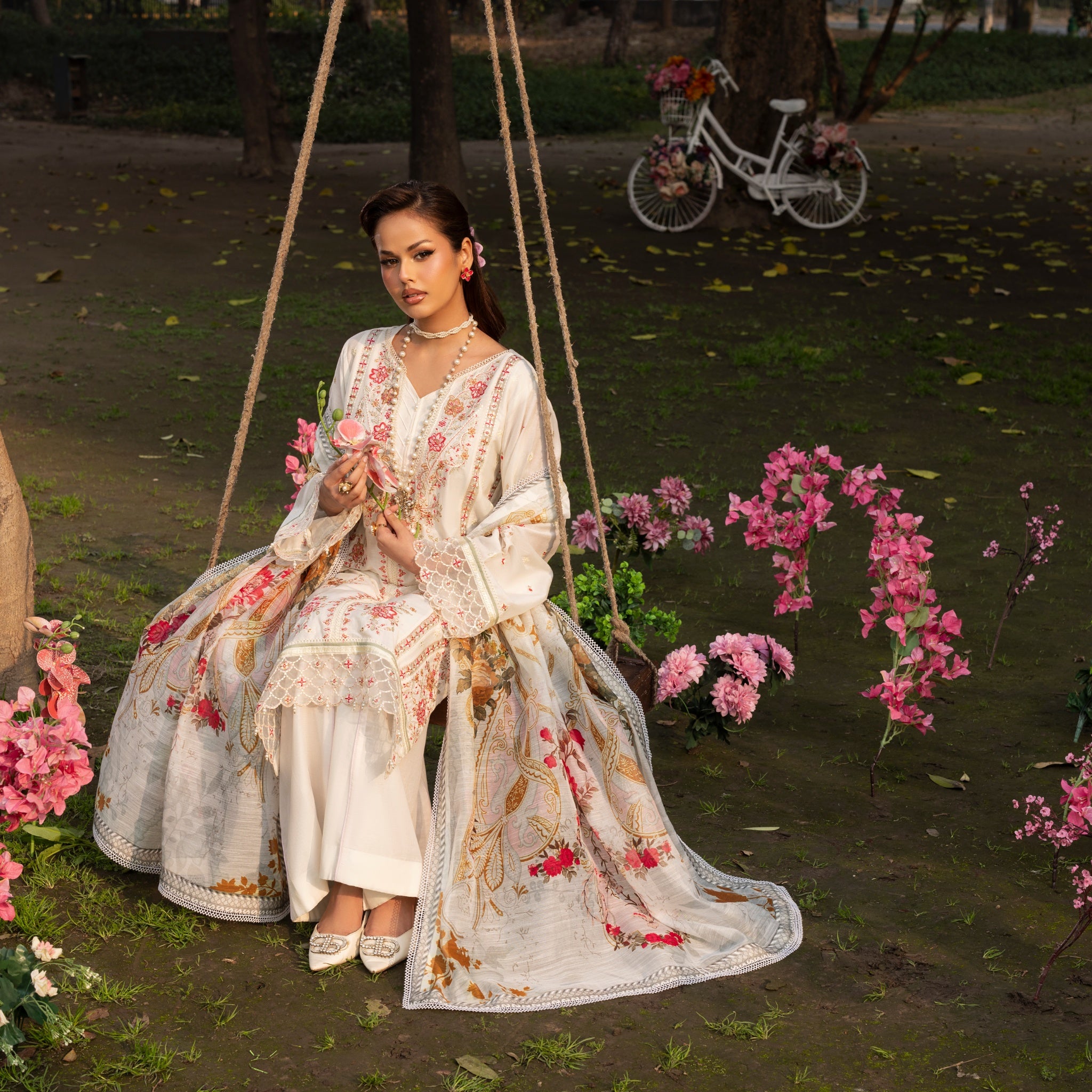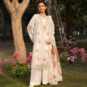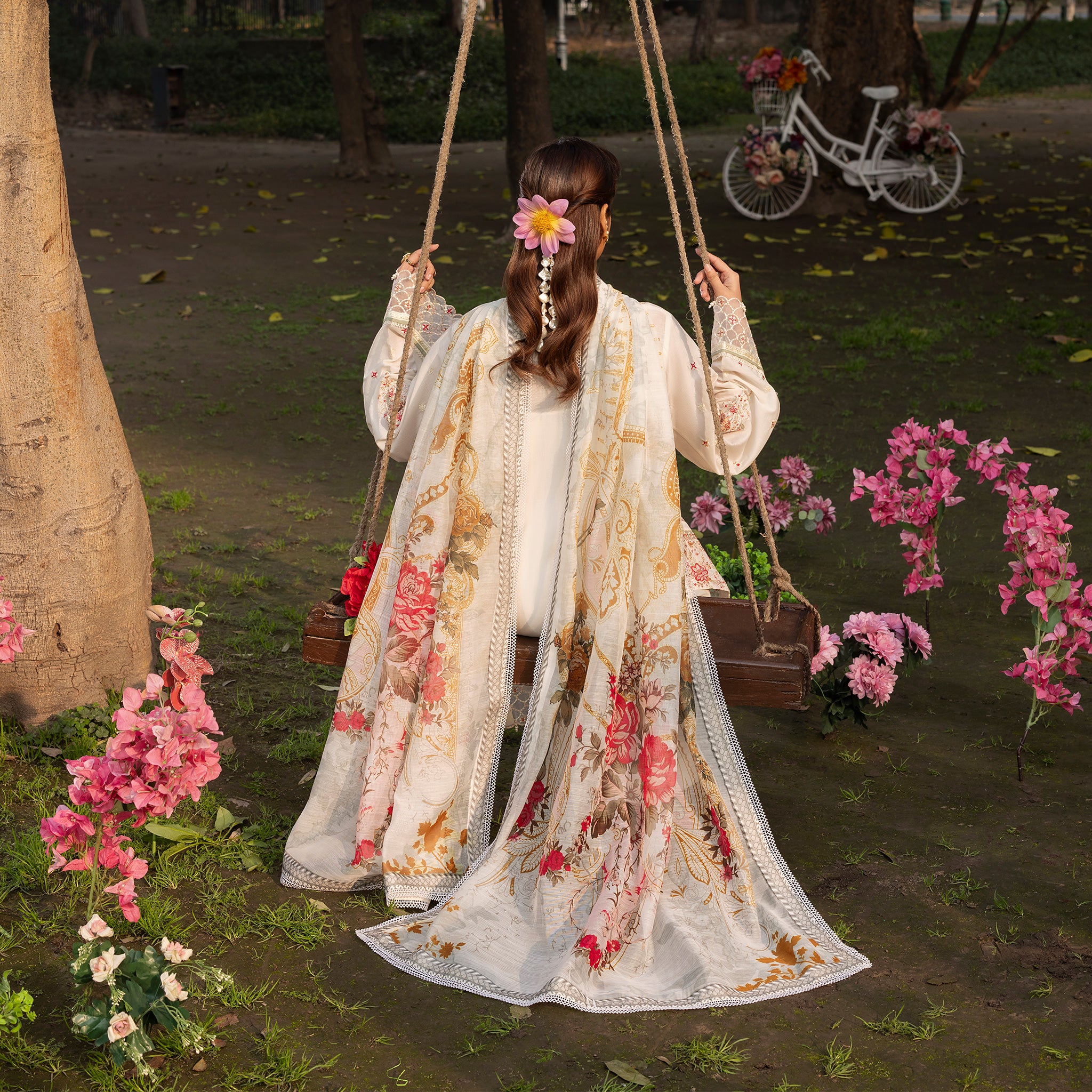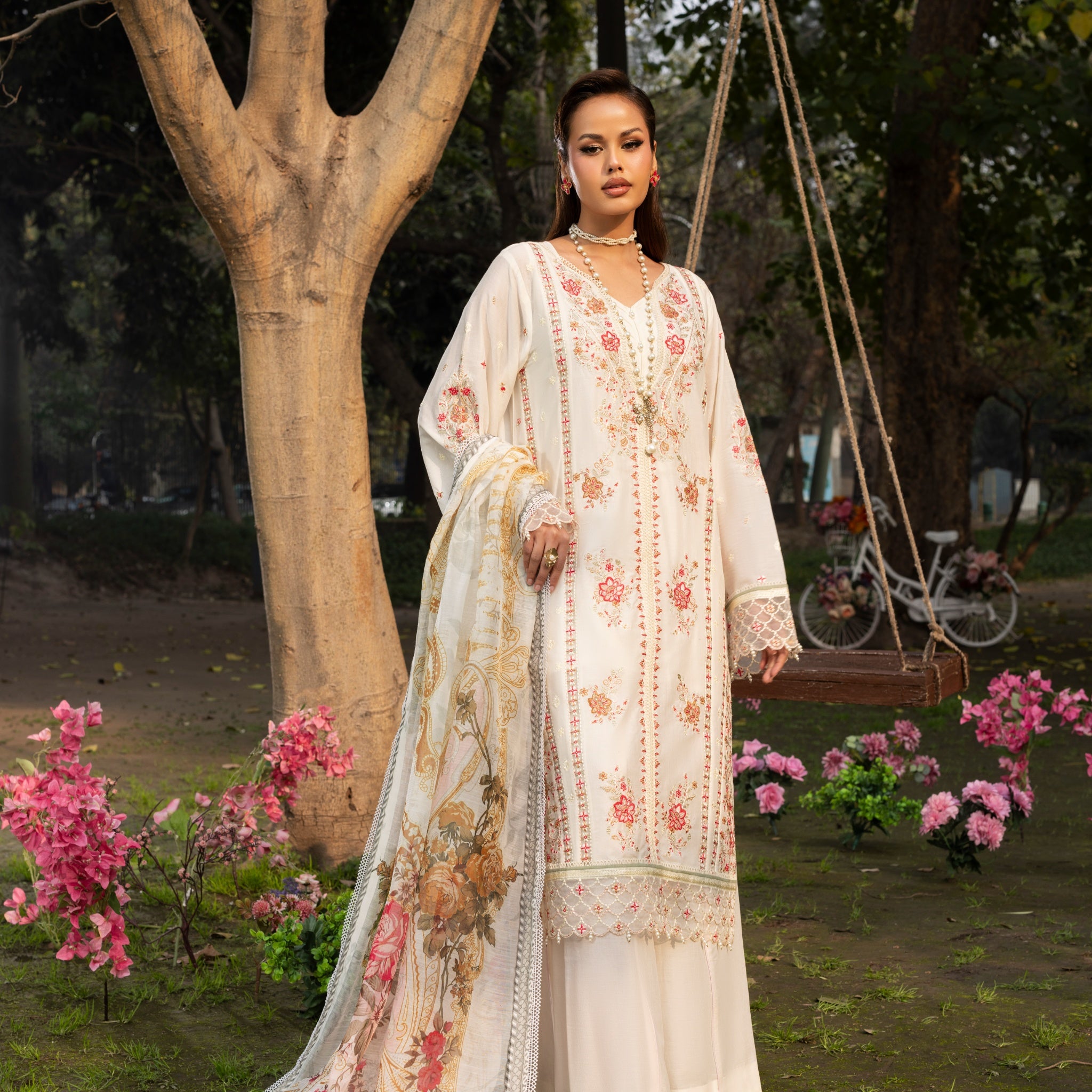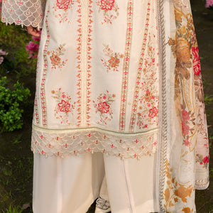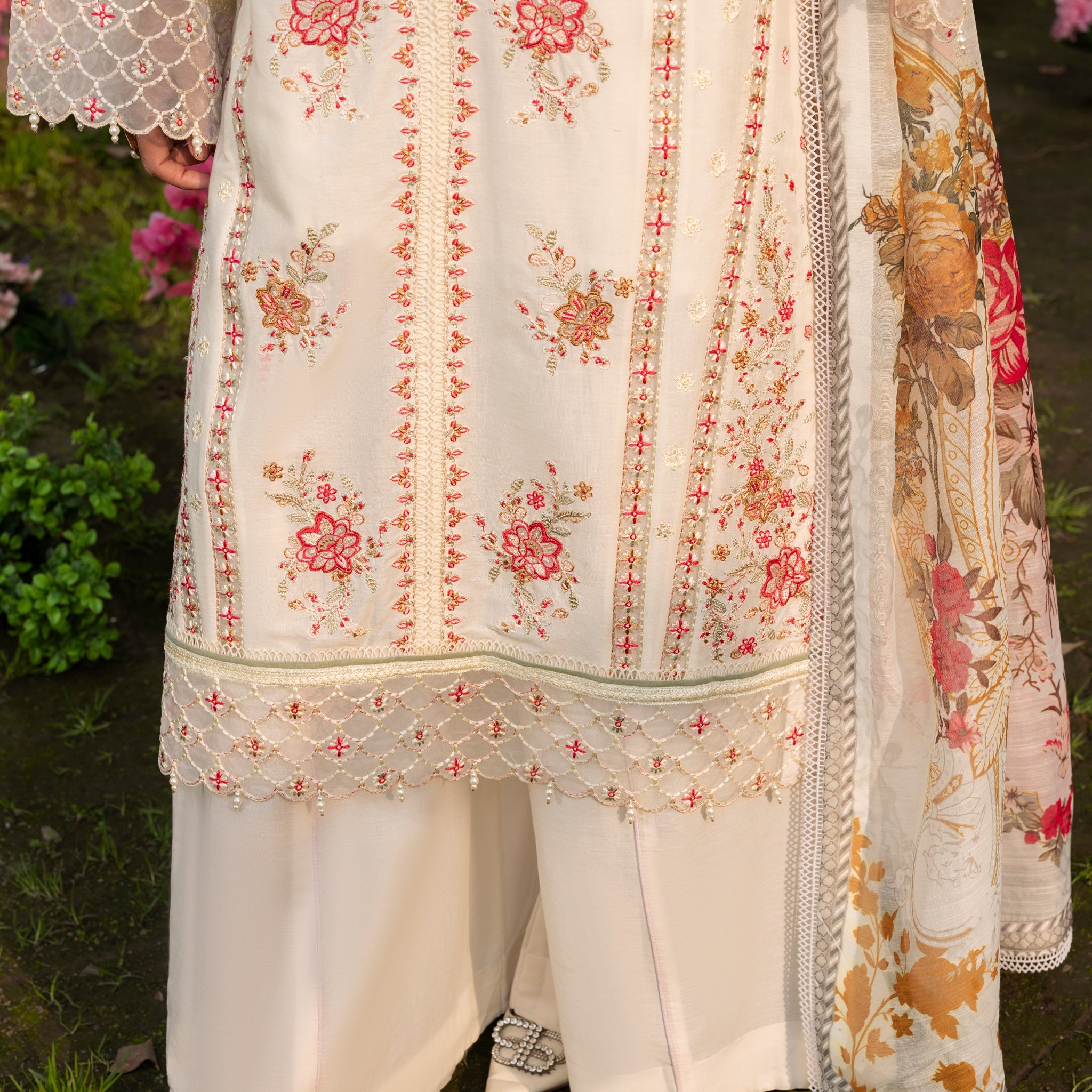 Long Length Shirt with straight trouser, paired with printed dupatta; this outfit competes the look with embroidery and organza patch work